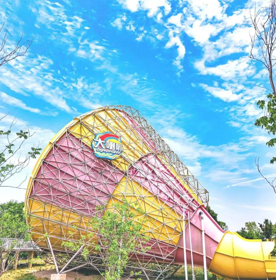 大喇叭:坐在特别设计的浮圈里面滑行,从20多米高处滑行到一个巨大的喇叭型锥体里面,仿佛被龙卷风吸进去,惊险刺激,给你超强体验感。