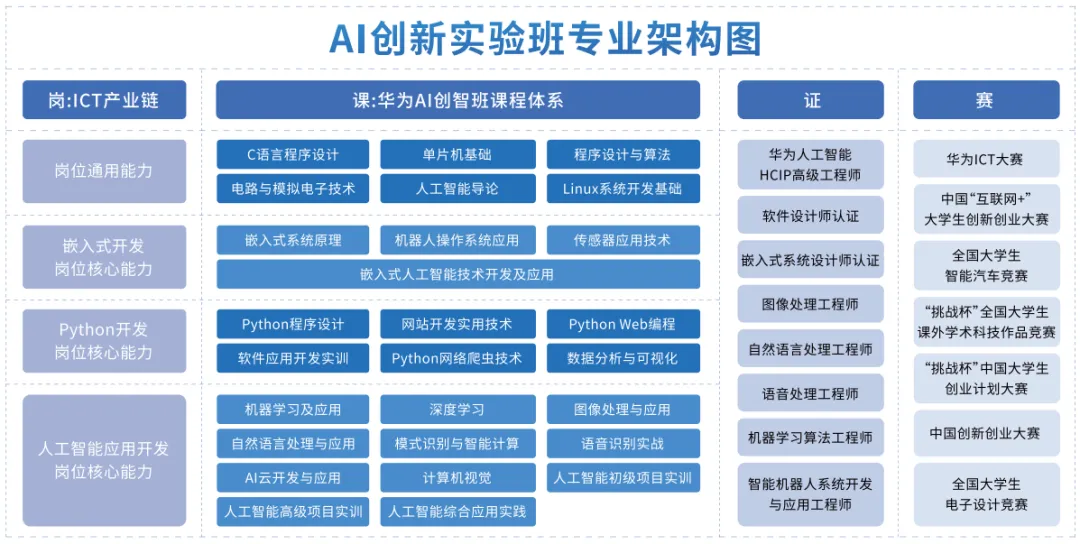 开设AI创新班,采用“2+1+1”新型人才培养模式:2年专业基础学习,1年华为专项技术学习,1年企业实习。毕业时可获得我校毕业证、学位证,还可获得华为资深人工智能工程师职业资格证书(HCIP)。我校华为ICT学院获评“华为ICT学院千校万里行--基础软件百校种子计划2022优秀华为ICT学院”,成功晋级为卓越华为ICT学院。