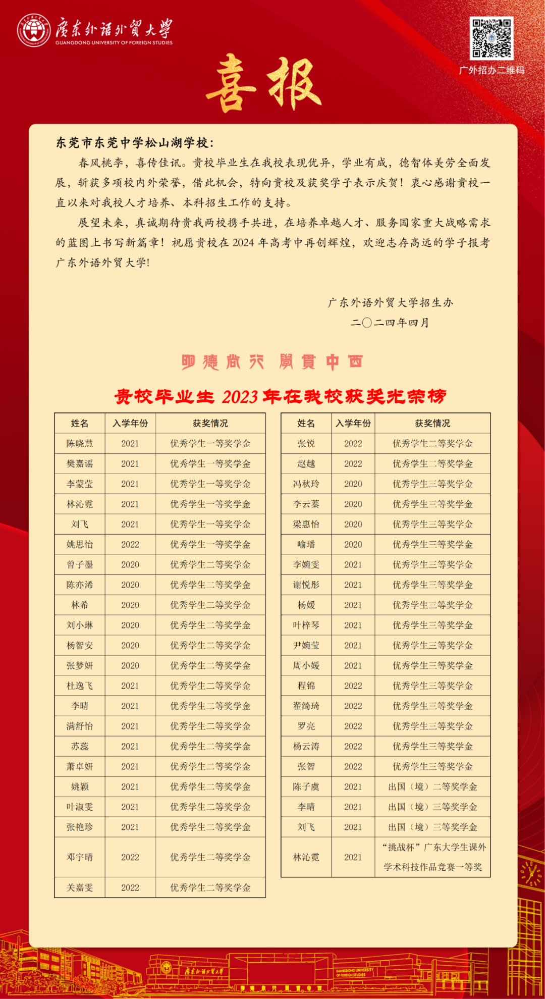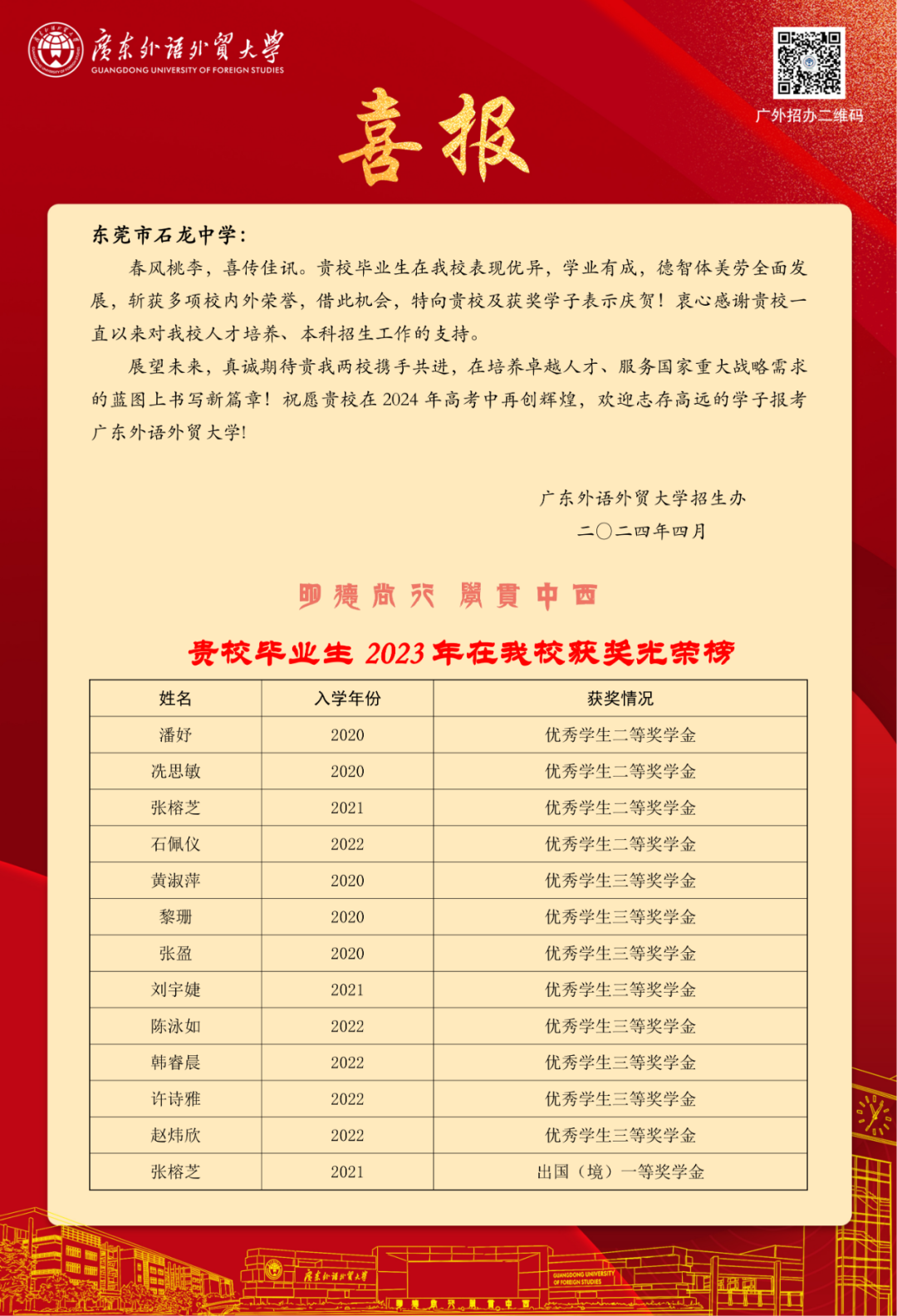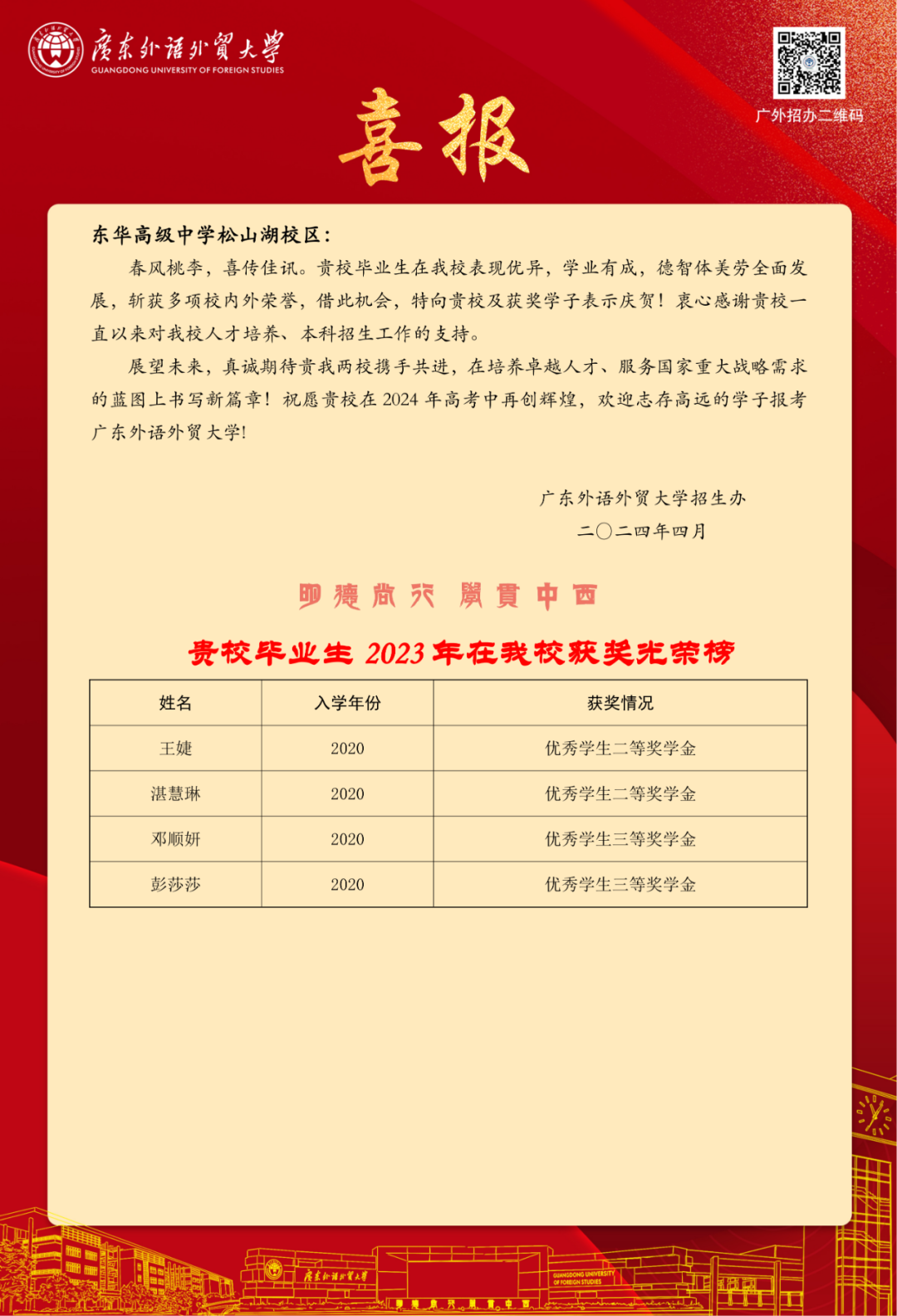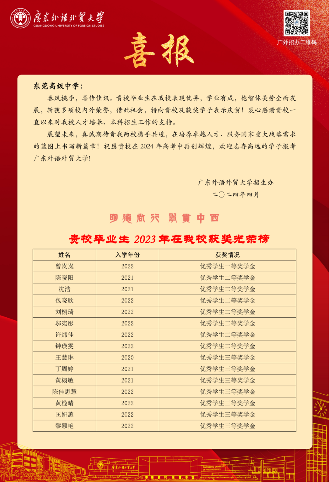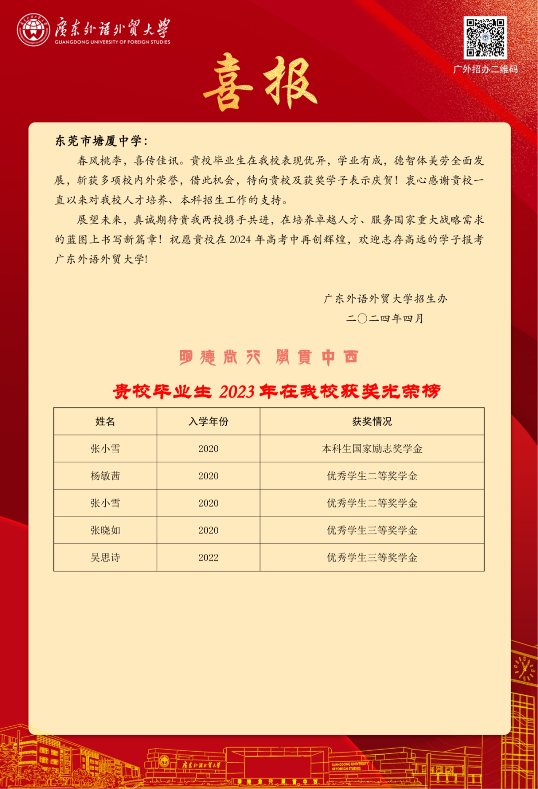 春风桃李,喜传佳讯。贵校毕业生在我校表现优异,学业有成,德智体美劳全面发展,斩获多项校内外荣誉,借此机会,特向贵校及获奖学子表示庆贺!衷心感谢贵校一直以来对我校人才培养、本科招生工作的支持。