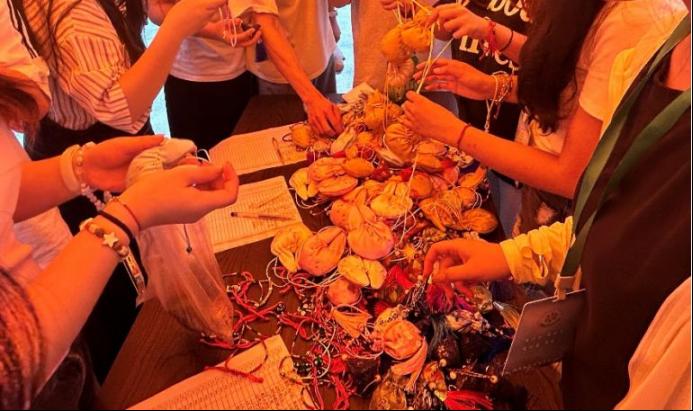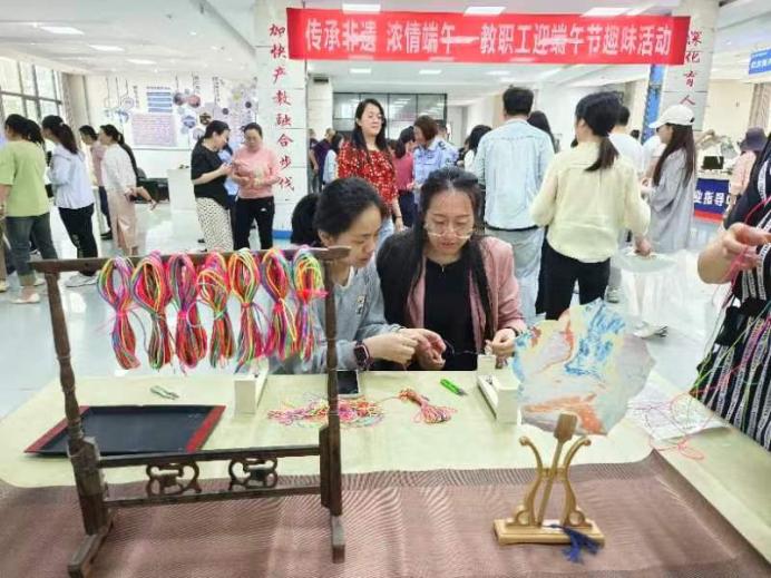 “带个香草袋,不怕五虫害”,佩戴用艾草、香草等中草药填充的香囊有助于安神,防蚊虫叮咬;五彩绳不仅具有辟邪作用,还有祈求平安吉祥、带来好运和祝福平安的美好寓意。江服师生亲手将代表健康平安的艾叶缝制进香囊,DIY出自己喜爱的款式,为自己和家人送上美好的祝福,活动现场充满了欢乐祥和的氛围。