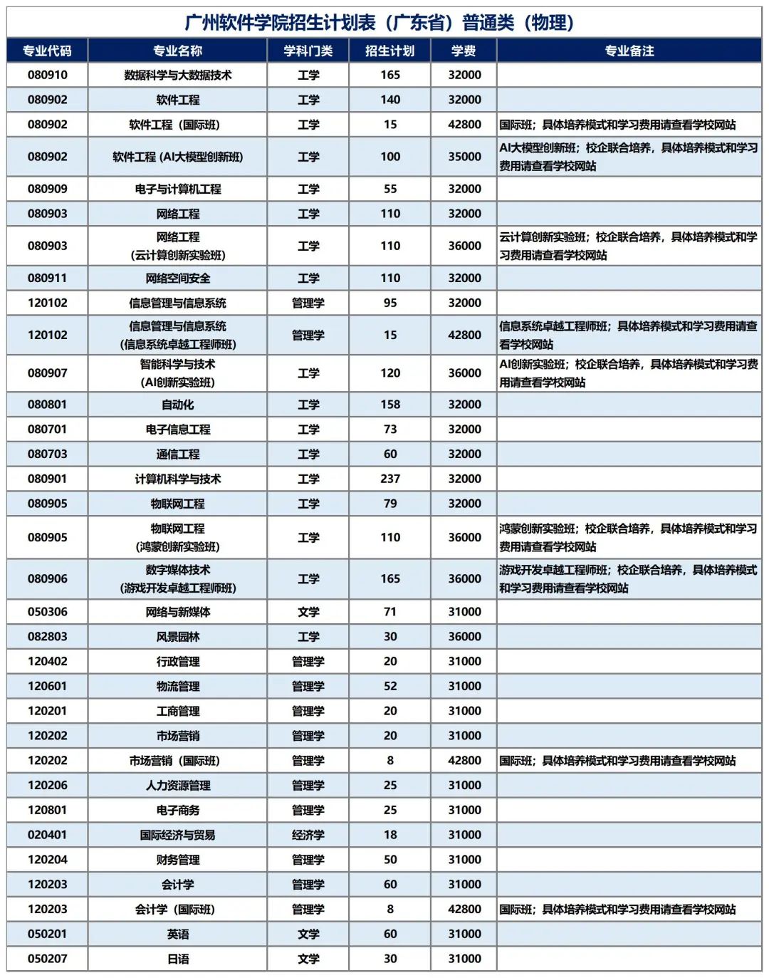 招生计划表(广东省)普通类(物理)