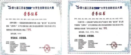 学院强化创新创业项目培育指导工作。近年来,在“互联网+”“挑战杯”等大学生创新创业比赛中,我院学生主持的多个项目进入学校比赛并被学校推荐参加省赛、市赛。2021年“乡村振兴谋发展,产业转型致富路”获第十七届“挑战杯”大学生课外学术作品竞赛红色专项江苏省三等奖;“豆废不弃”等项目获第七届“互联网+”江苏省赛一、二、三等奖,获得第八届中国国际“互联网+”大赛全国二等奖;2024年“雨中真相-雨天模糊图像高清处理先行者”荣获第十四届“挑战杯”大学生创业计划竞赛江苏省选拔赛铜奖;学院鼓励有兴趣、有能力的学生提前参与老师的科研项目,引导学生把专利申请与专业学习相结合,为学生开展专利研究提供必要的设备、技术支持。近年来,学生以第一作者共申请发明专利10余项。同时,学院组织学生积极申报大学生创新创业训练项目,几年来学生共成功申报相关项目70余项,其中省级以上20余项。