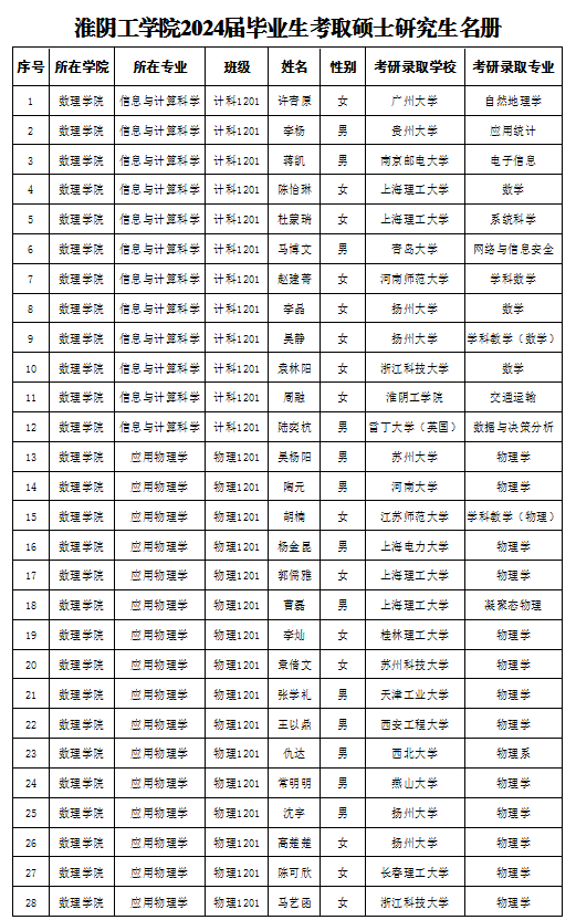 为保障毕业生就业工作稳步有序开展,学院不断健全完善就业指导服务体系,推动毕业生充分就业、满意就业,近些年学院年终就业率始终保持在96%以上,就业去向主要集中在信息产业、经济与金融、IT行业、教育、公务员等热门领域,培养的毕业生以良好的专业素养和应用能力受到用人单位的广泛好评。同时,学院积极开展访企拓岗、送岗上门等就业帮扶工作,积极宣传留淮就业创业政策,得到淮安市政府以及学校的高度认可,获得淮安市“留淮就业突出贡献梧桐奖”、校就业工作先进集体等荣誉。近年来,毕业生中有超过30%的同学选择了读研深造,学院获校考研突出专业奖、考研先进个人等荣誉称号,2024年学院考研录取率超过35%,应用物理学专业考研录取率达到41.1%,近几年多名毕业生被中国科学技术大学、南京大学、武汉大学、南京航空航天大学、苏州大学等著名高校录取。
