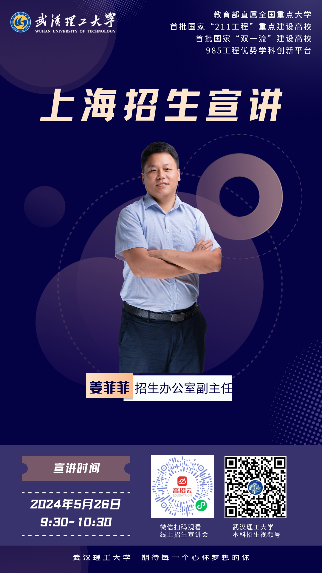 2024年武汉理工大学分省专场直播系列学校概况、招生政策学生发展、校园环境你想了解的这里都齐全5月26日9:30武汉理工大学招生办公室姜菲菲老师为你带来武汉理工大学上海招生专场宣讲微信扫描图中二维码进入直播间观看收听我们不见不散~-----welcome to WUT-----欢迎关注武汉理工大学本科招生视频号编辑:高嘉博审核:曲帅锋