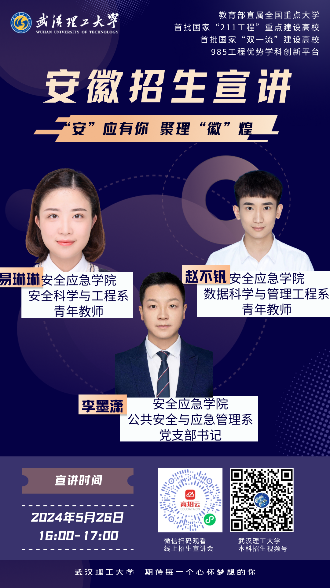 2024年武汉理工大学分省专场直播系列学校概况、招生政策学生发展、校园环境你想了解的这里都齐全5月26日16:00安全应急学院易琳琳、赵不钒、李墨潇为你带来武汉理工大学安徽招生专场宣讲微信扫描图中二维码进入直播间观看收听我们不见不散~-----welcome to WUT-----欢迎关注武汉理工大学本科招生视频号编辑:高嘉博审核:曲帅锋