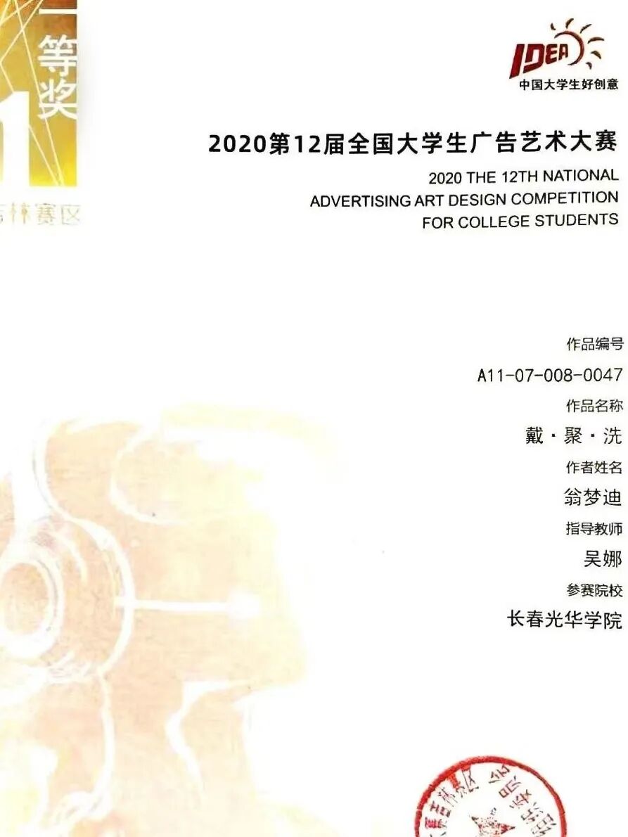 学生获2020第12届全国大学生广告艺术大赛