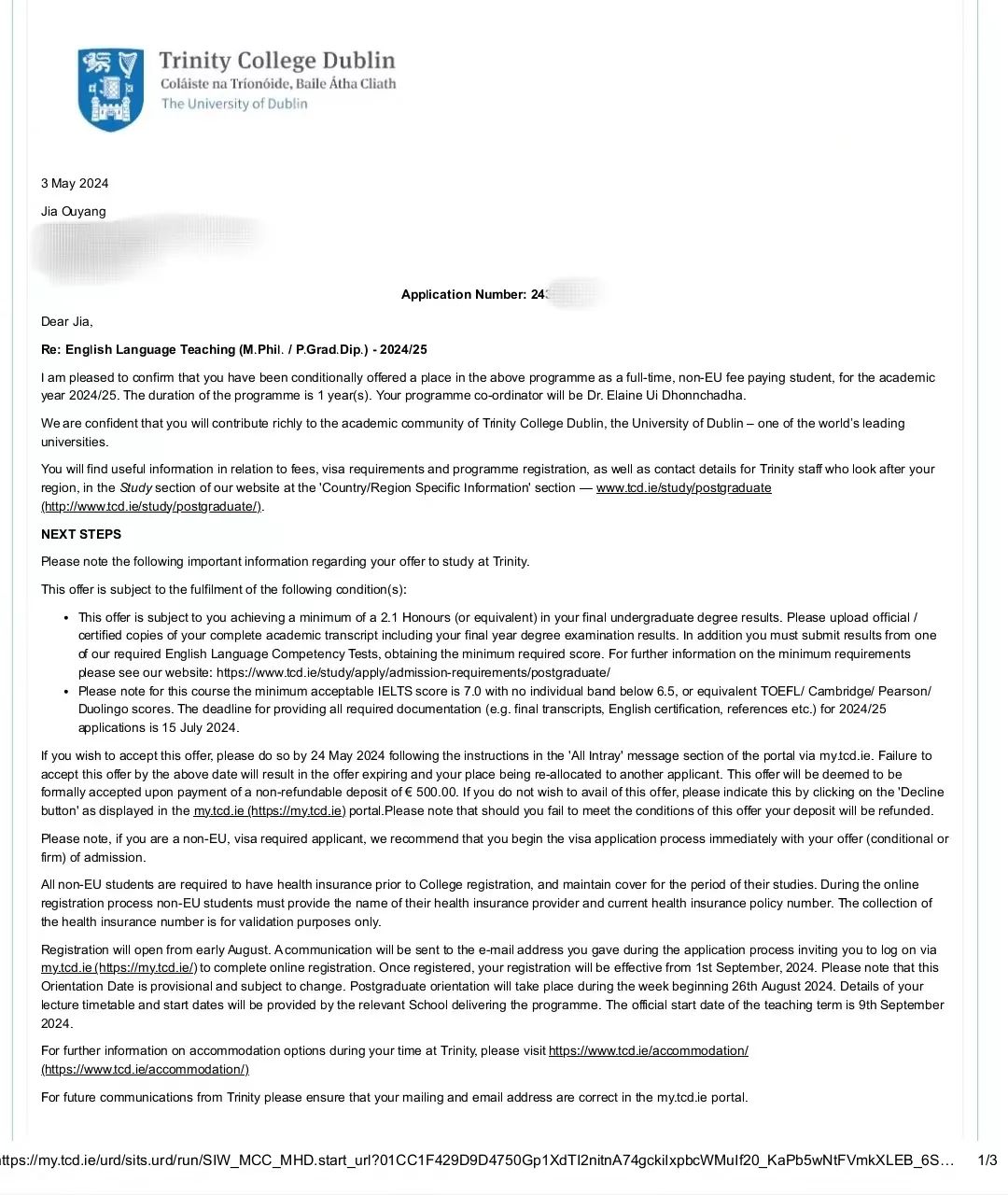 欧阳珈特别想感谢外语系老师在申请留学中的支持,在梁洁主任和李天照老师的帮助下完成了都柏林圣三一大学的一些资料审查工作,他们还帮欧阳珈撰写了推荐信,虽然申请的专业没有推荐信的硬性要求,但这也是一个很重要的加分项。