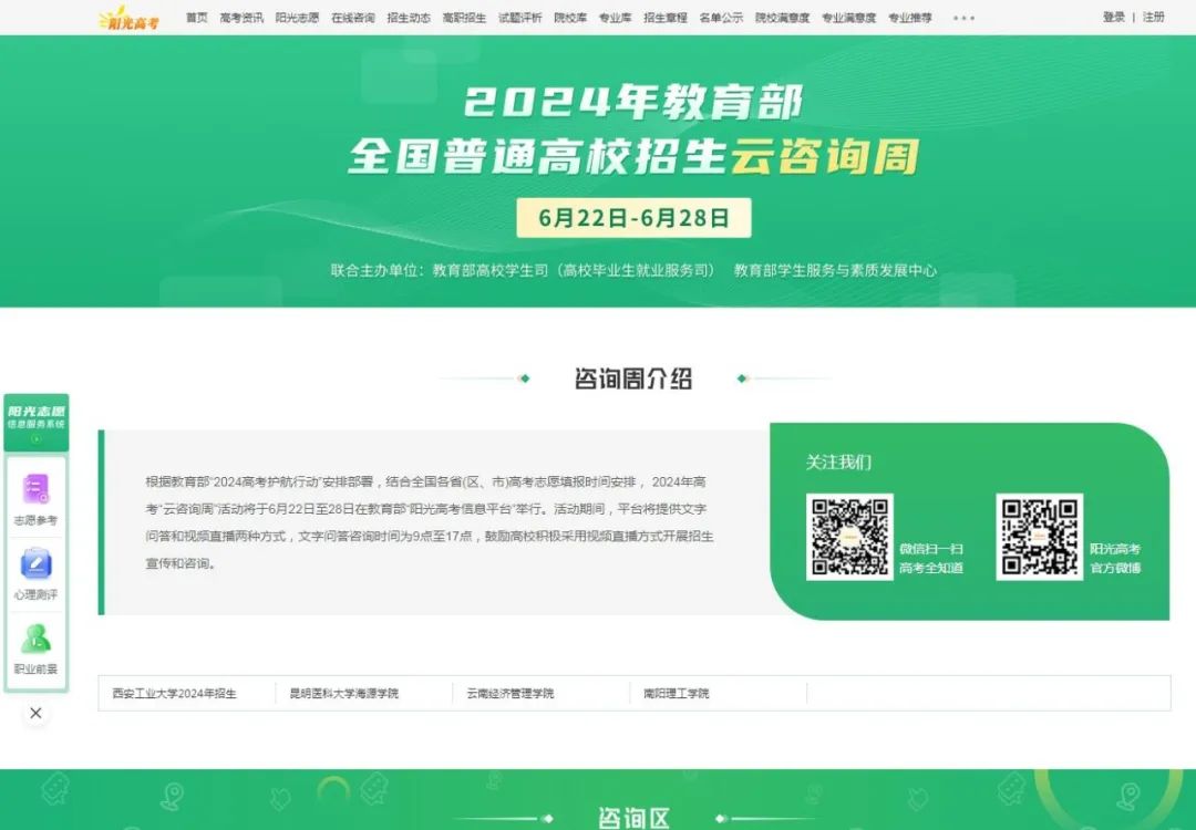 根据教育部“2024高考护航行动”安排部署,结合全国各省(区、市)高考志愿填报时间安排,“2024年高考网上咨询周”活动将于6月22日至28日在教育部“阳光高考信息平台”举行。每日咨询时间为9点至17点,届时,吉林师范大学博达学院招生办公室有专人在线为考生、家长提供准确权威、周到细致的志愿填报咨询指导和服务。