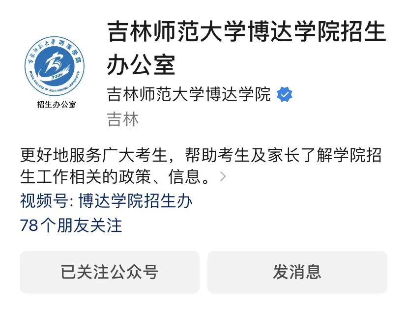 吉林师范大学博达学院招生办公室微信公众平台及时更新招生工作动态,服务广大考生家长,可以快速了解院系专业、查询录取分数等信息。