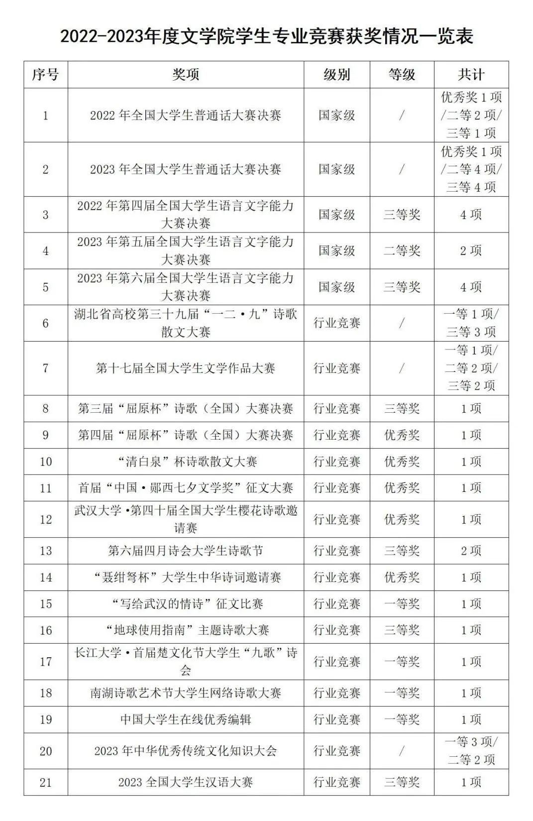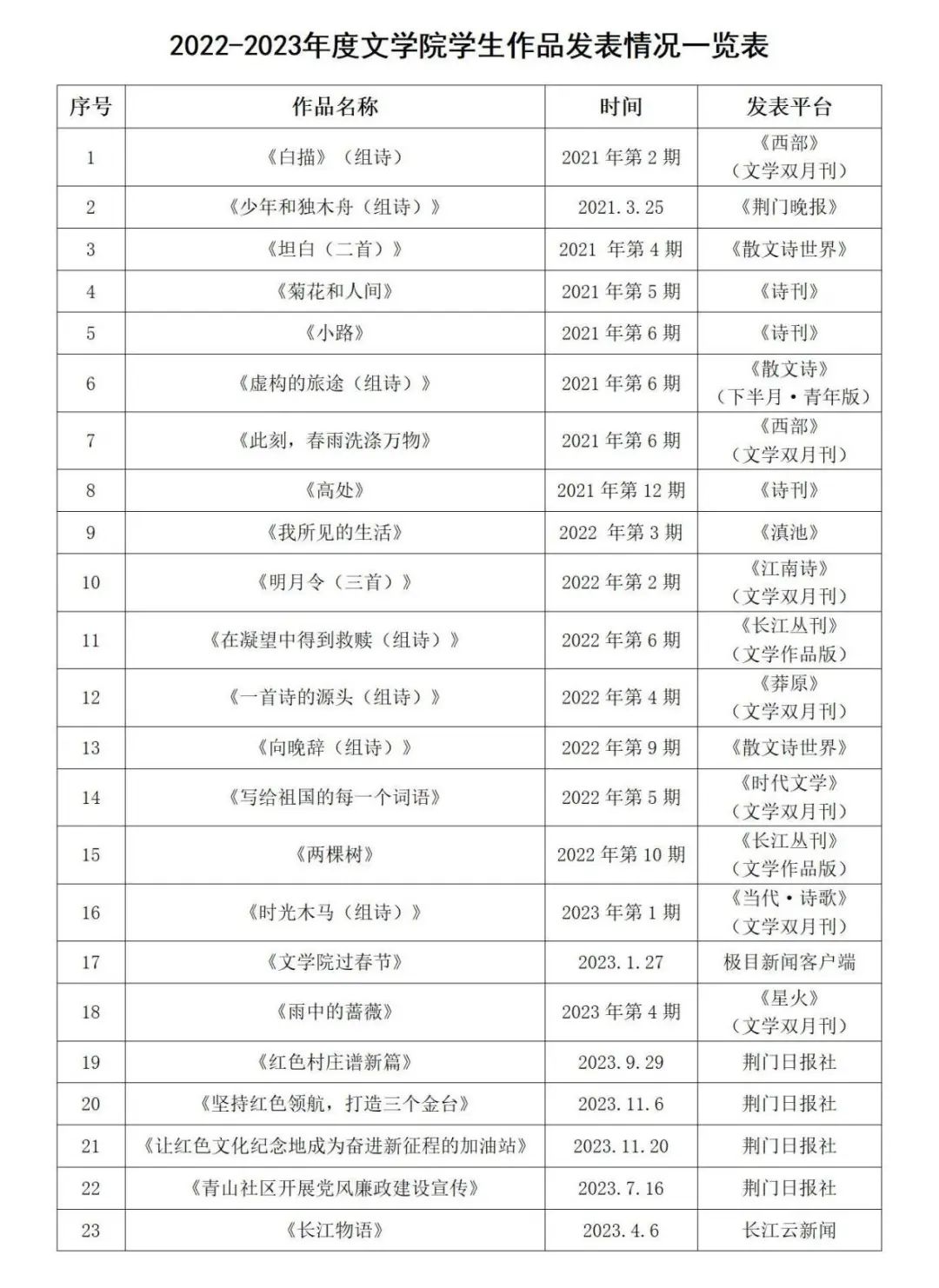 学院先后涌现大量的优秀学生典型,如“全国优秀共青团员”“中国大学生自强之星”翟文慧、湖北省慈善总会志愿者抗疫典型史钰荣等。近年来,学生在省级及以上各级各类专业竞赛中获奖300余项,立项国家及省级大学生创新创业训练项目16项,发表文学作品100余件。