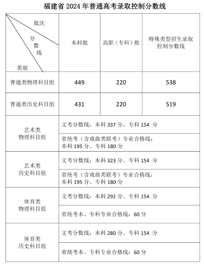 6月24日下午,福建省高等学校招生委员会召开全体会议,研究确定我省2024年普通高考切线方案,部署高招录取工作。经会议研究决定,福建省2024年普通高考各类录取控制分数线具体如下: