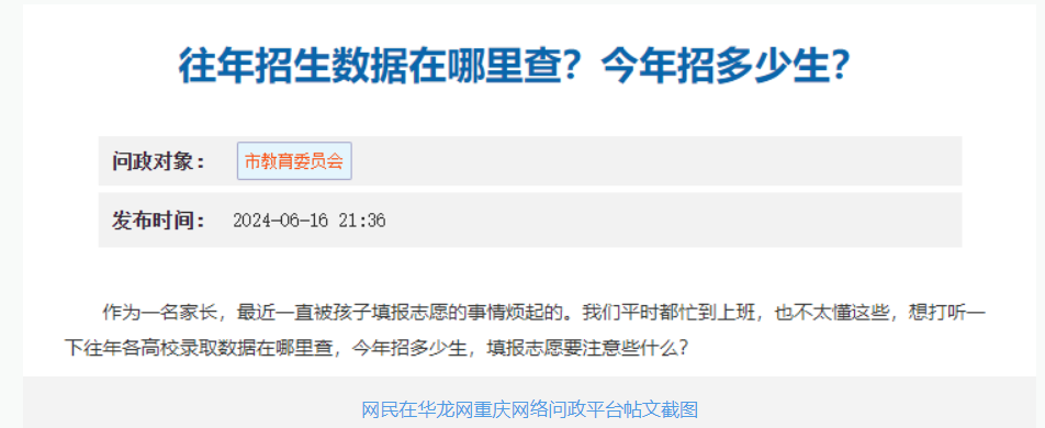 高考之后,考生和家长十分关心高考成绩以及填报志愿。6月16日,网民张先生在华龙网重庆网络问政平台发帖。他说,作为一名家长,最近一直在操心孩子填报志愿的事情。自己平时忙于上班,不太懂这方面的知识,想请问政平台帮忙打听一下往年各高校录取