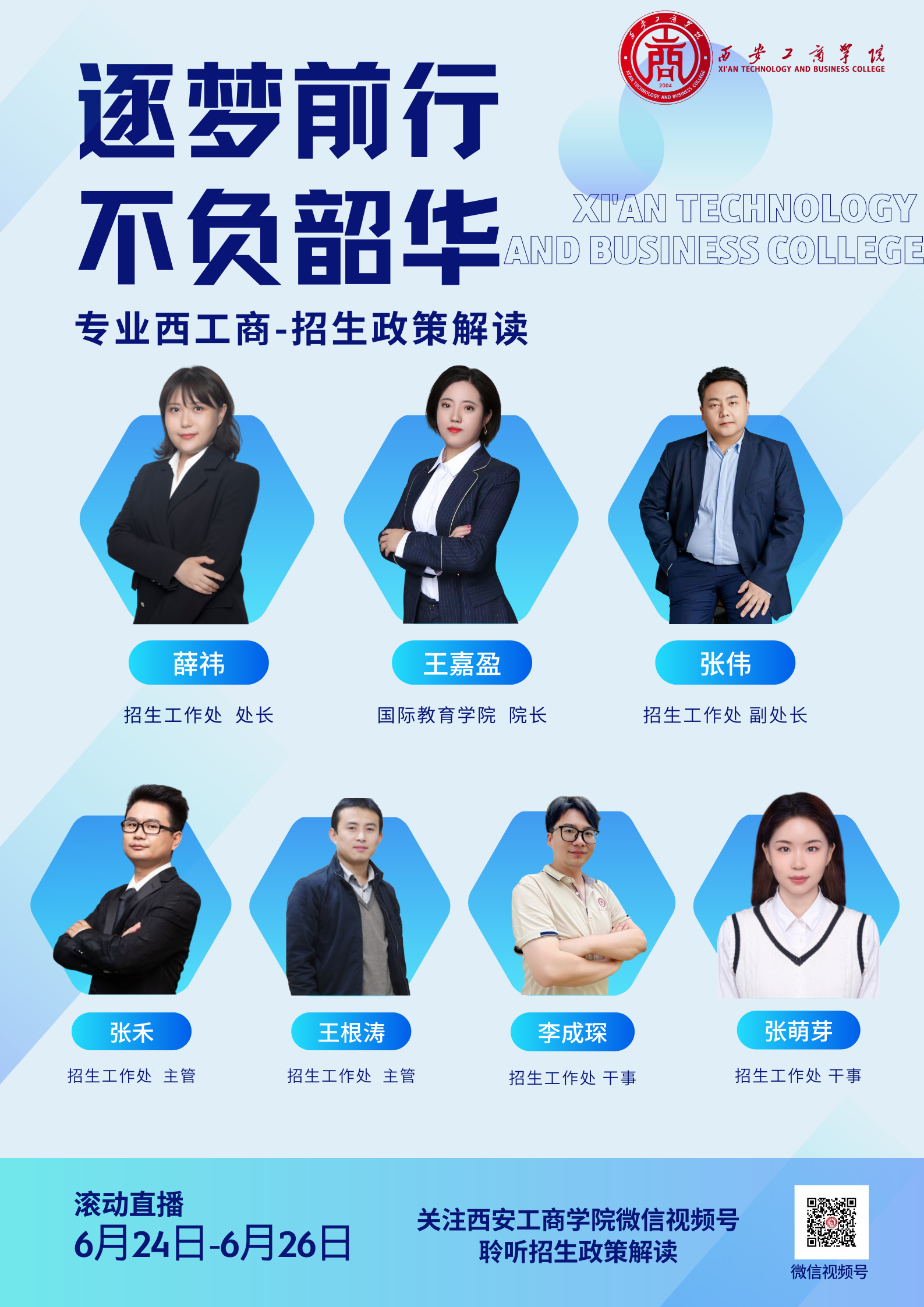 6月24日15:00-16:20;18:00-20:006月25日10:00-12:00;18:00-20:006月26日10:00-12:00各位考生锁定西安工商学院微信公众号或点击微信视频号观看直播~给各位同学带来全方面的招生政策解读,以助大家填报志愿之时知己知彼。