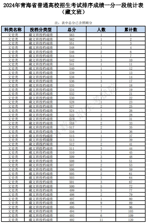 文章来源:青海教育考试网 2024年青海省普通高校招生考试排序成绩一分一段统计表(藏文班)