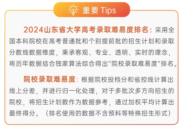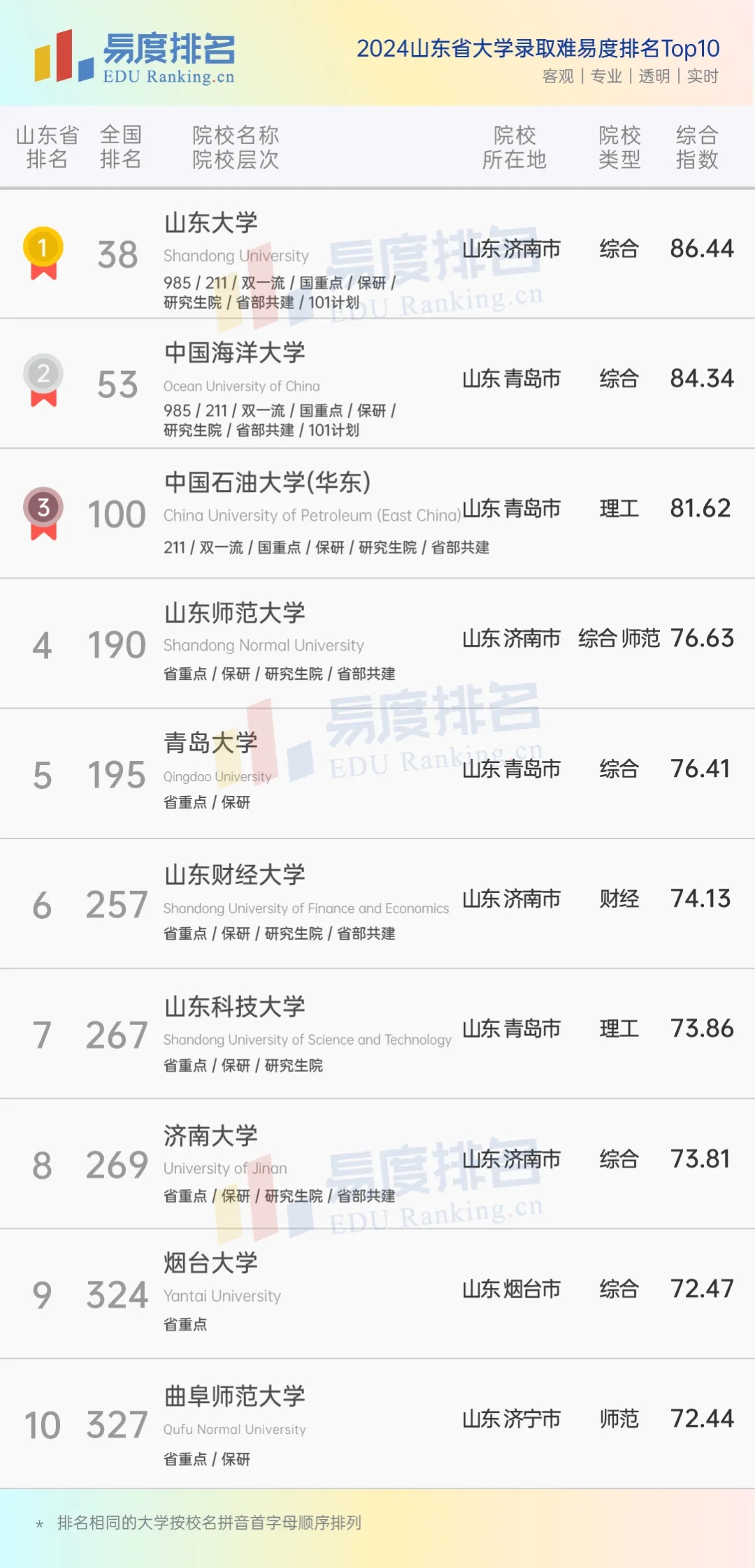 “2024山东省大学录取难易度排名”的对象是中国72所本科级院校。上榜的70多所院校中,985/211院校共3所,双一流院校共3所。