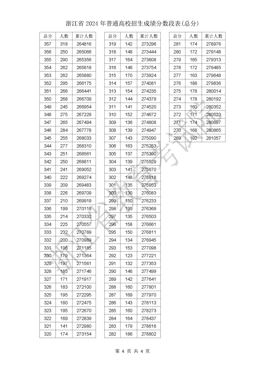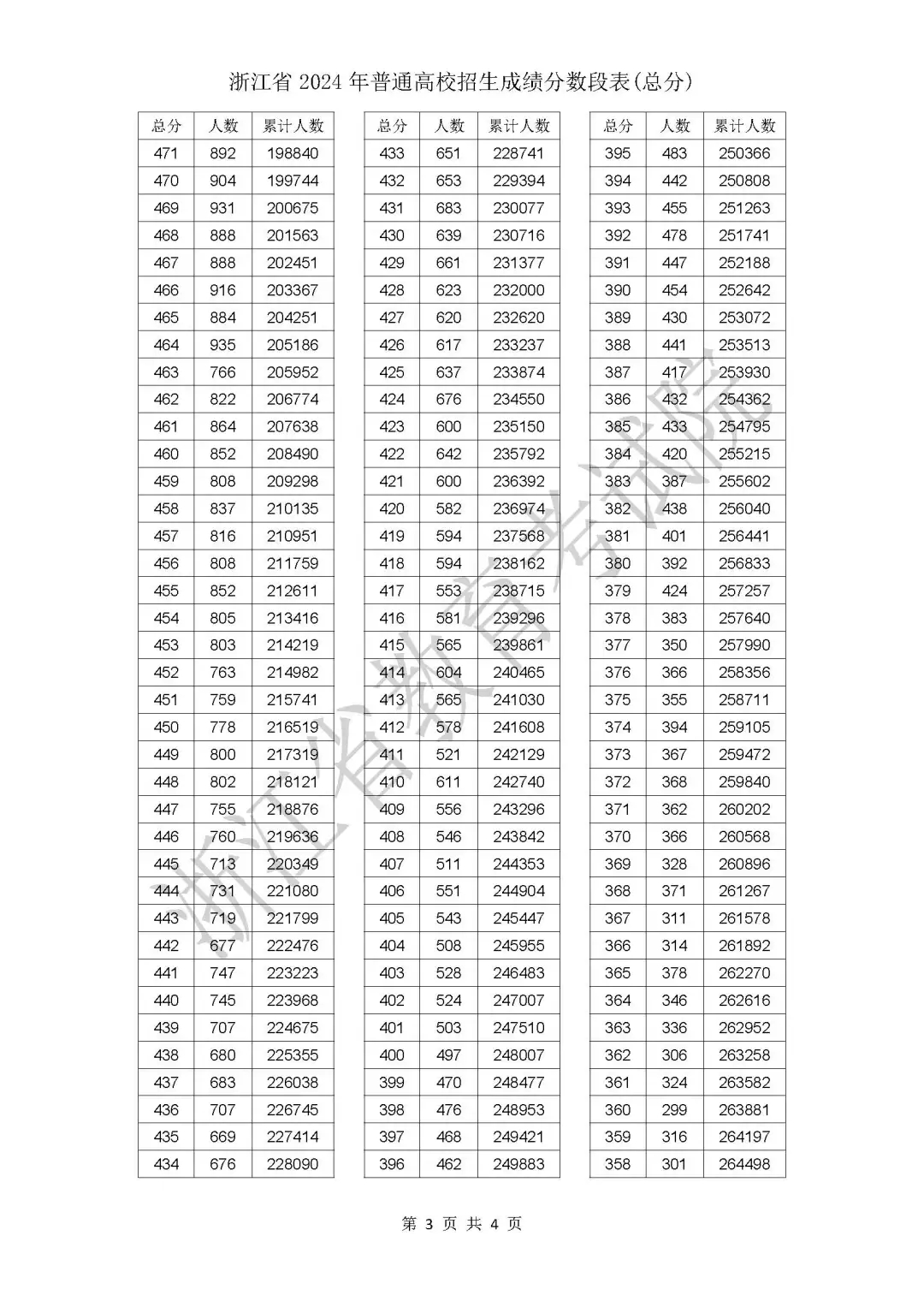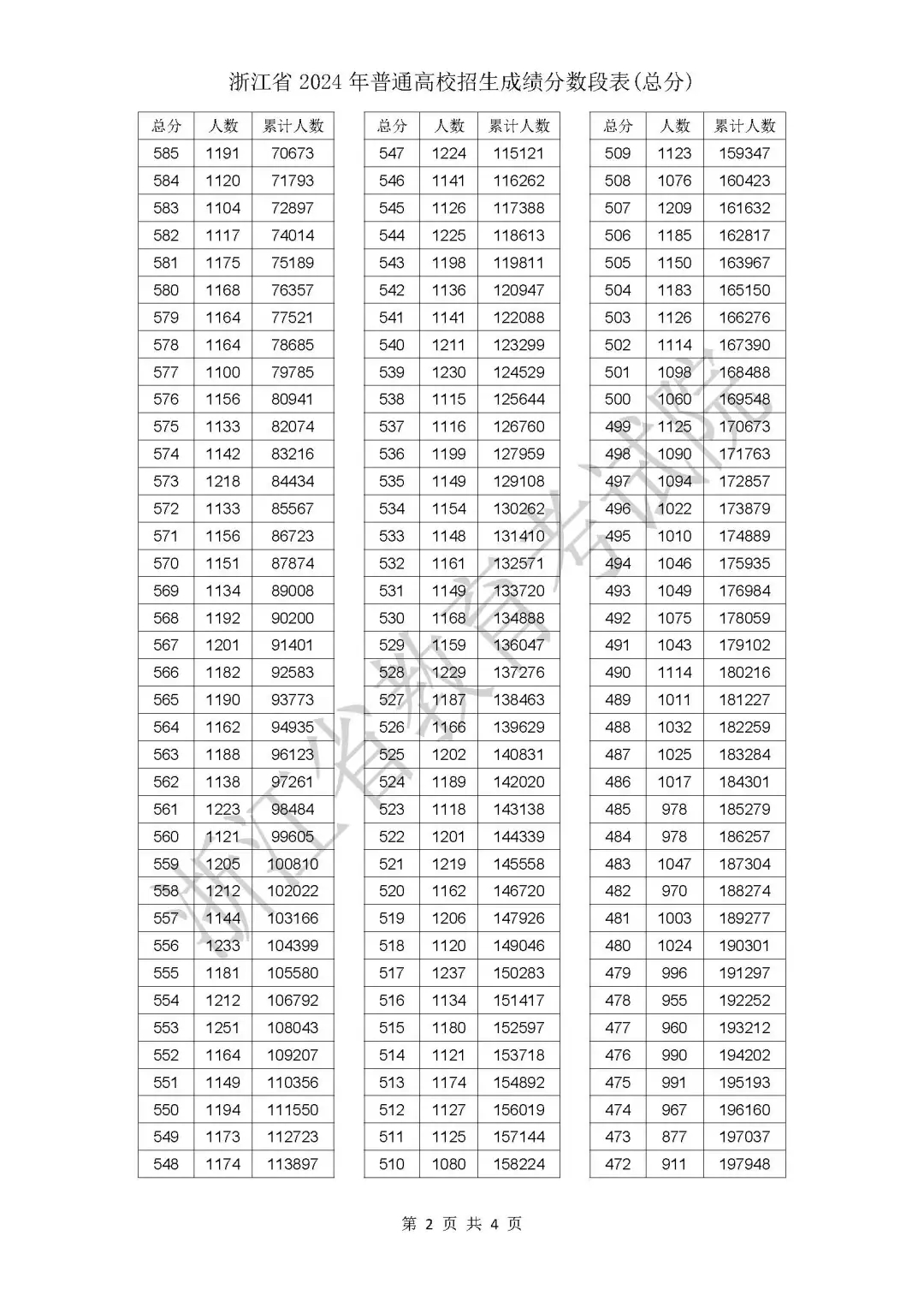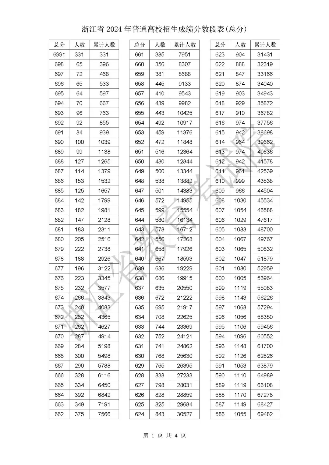 来源:浙江省教育考试院浙江省2024年普通高校招生成绩分数段表(总分)
