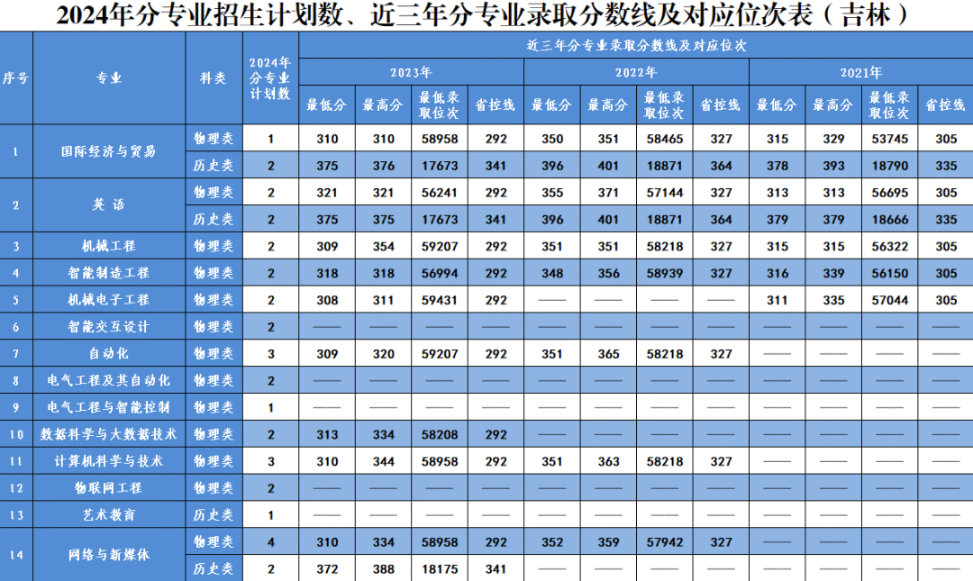 二、2024年吉林省分专业招生计划数,近三年分专业录取分数线及对应位次表