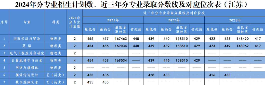 二、2024年江苏省分专业招生计划数,近三年分专业录取分数线及对应位次表