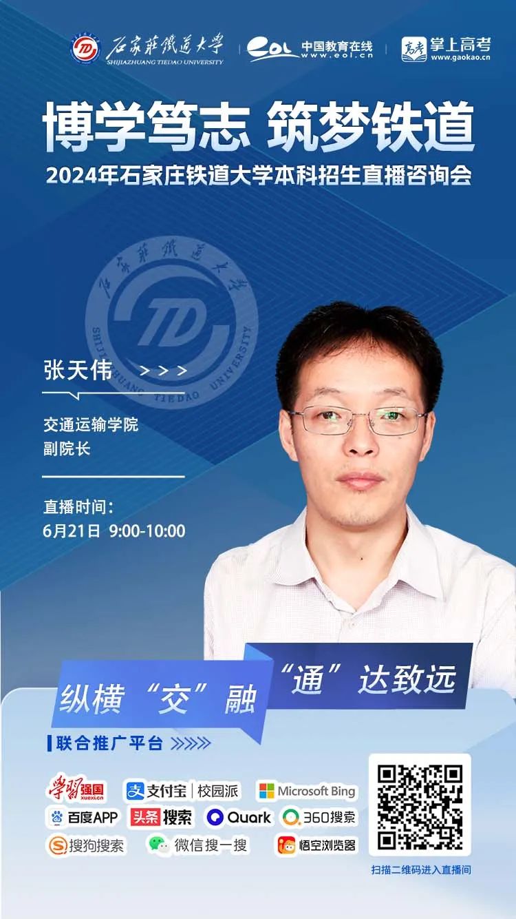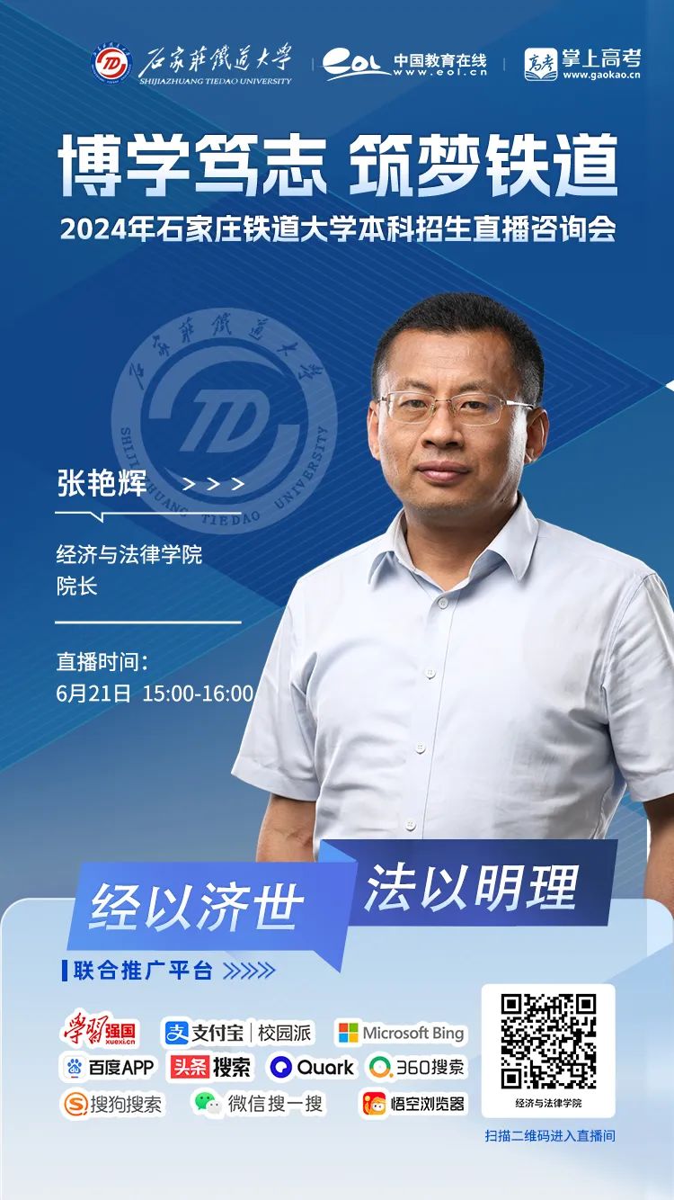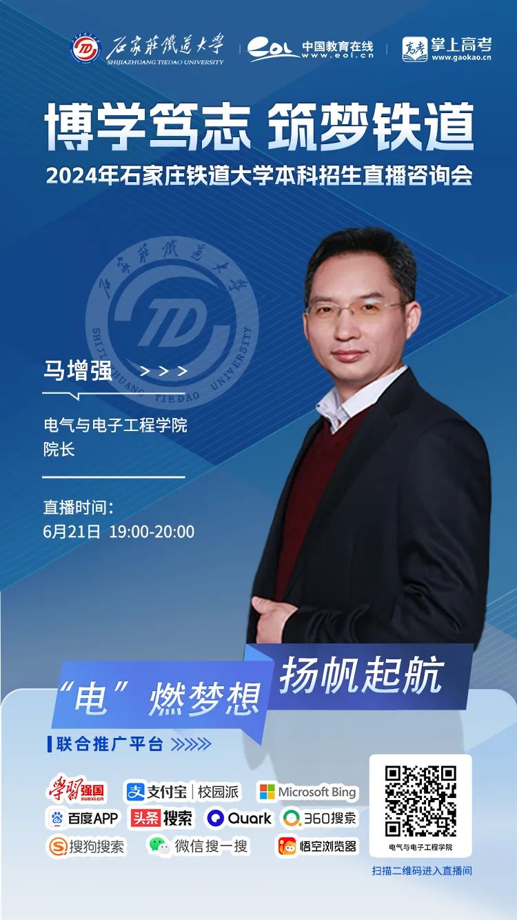 2024年高考已经落下帷幕,石家庄铁道大学招生办公室预祝各位考生蟾宫折桂,金榜题名。为进一步做好我校2024年本科招生宣传工作,帮助各考生及家长及时、全面了解我校最新招生政策,学生处招生办公室邀请到我校13个学院(系)院长(主任)做客“博学笃志 筑梦铁道”网络直播间,介绍院(系)整体情况,并为广大考生及家长在线答疑,提供志愿填报咨询服务。