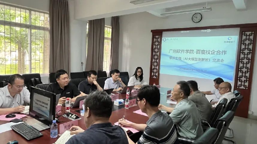 广软与百度智能云开展校企合作软件工程(AI大模型创新班)交流会6月13日,广州软件学院软件工程系与百度智能云共建软件工程(AI大模型创新班)交流会在日新楼103会议室举行。广州软件学院徐祥副校长、袁志副校长、软件工程系潘正军主任、徐向春书记、陈孝如副主任、产业学院黄炜迦副院长、系部4名骨干教师与百度智能云南部地区总监宋怀广、南部地区销售经理于博、教育行业高级解决方案架构师王江天、百度飞桨(广州)人工智能产业赋能中心解决方案总监廖启丰、生态拓展经理代翠翠出席了本次交流会。此次交流会旨在加强校企双方的沟通与协作,共同探讨软件工程(AI大模型创新班)的发展,以及AI大模型在软件工程领域的应用与创新。此次交流会的成功举行,为广州软件学院软件工程系和百度智能云之间的合作奠定了坚实的基础。未来,双方将继续深化合作,共同探索AI大模型在软件工程领域的人才培养新模式。