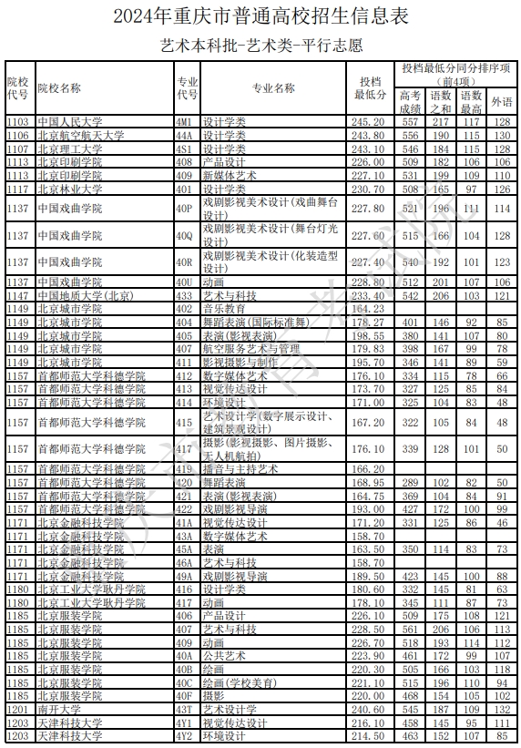 2024年重庆市普通高校招生信息表艺术本科批(艺术类-平行志愿)