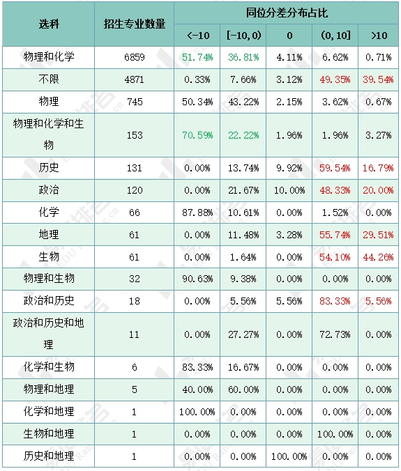 下表展示了浙江各选科的同位分差分布情况,“物理和
