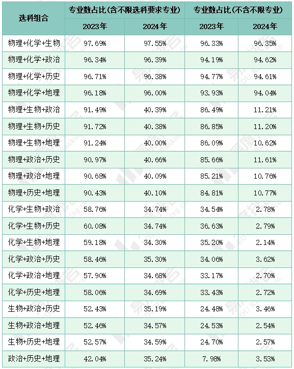 表 1 2023-2024年浙江高考本科各限选科目专业数及占比