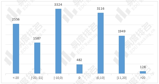 可以看出仅53%的专业与上一年度的同位分差在 10 分以内,约31%的专业同位分下降10分以上,16%的专业同位分上升10分以上。受选科改革影响,2024年浙江投档分波动极大。