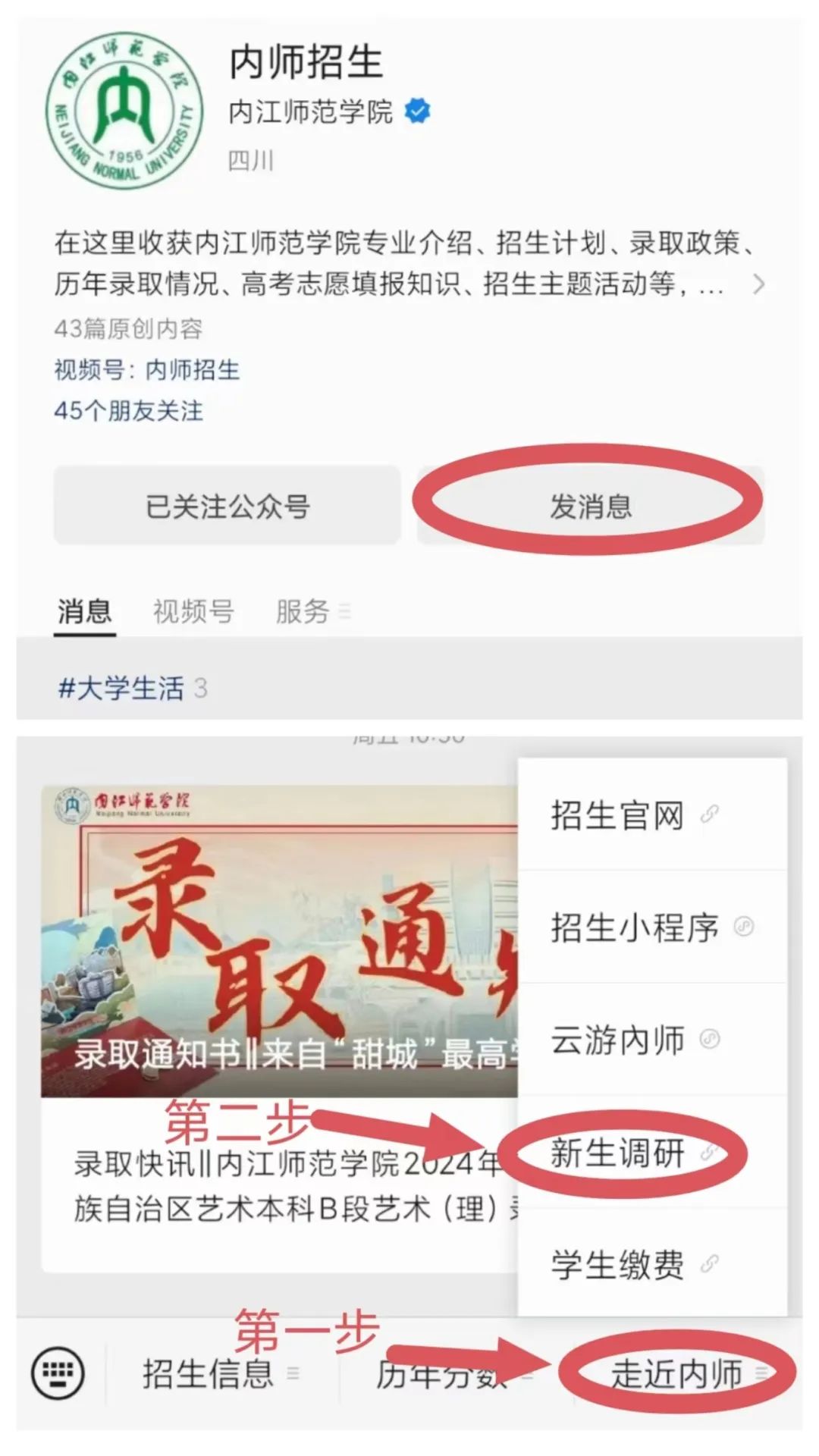 01步骤一微信公众号“内师招生”进入菜单栏-点击“招生信息”-点击“录取查询”,查看快递单号。