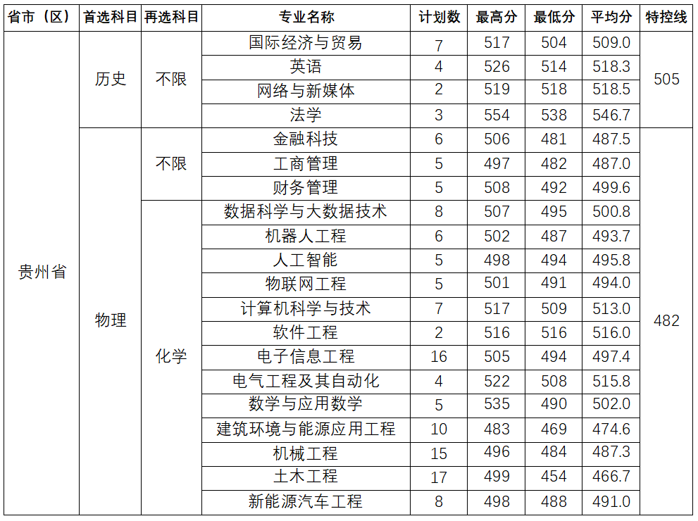 我校在贵州省普通本科批执行历史类计划16人,满额录取16人,最高分554,投档分504;物理类计划124人,满额录取124人,最高分535,投档分454。历史类和物理类双破特控线!具体情况如下: