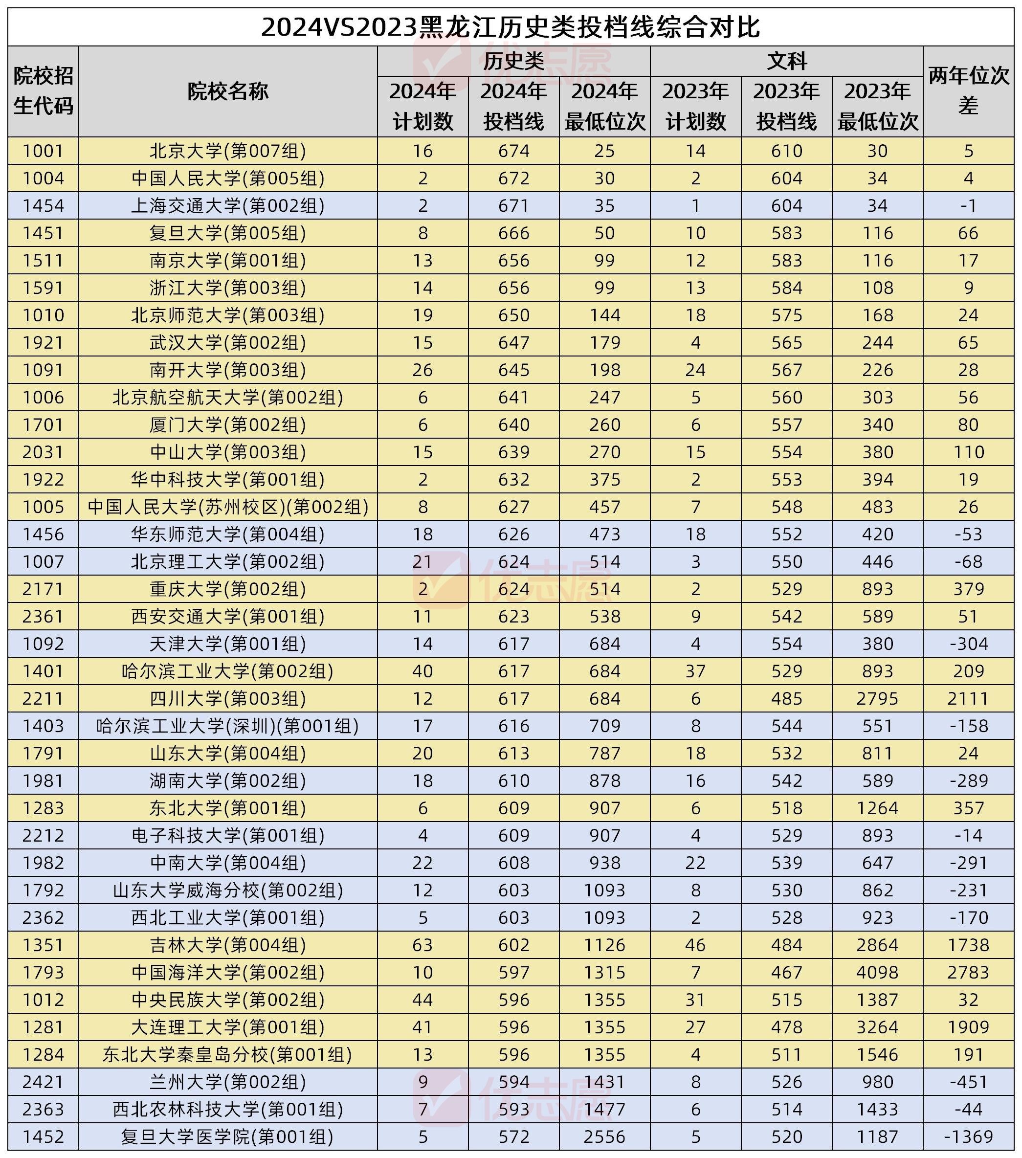 根据黑龙江2024年历史类投档线排名,我们可以发现,TOP10院校与去年保持一致。其中,复旦大学(第005组)以666分的投档成绩,赶超浙江大学(第003组),位列第四。据小优推测,这可能与复旦大学新增的法学专业有关。