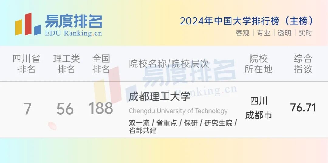 成都理工大学在全国的排名虽然变化较小,却也在逐年攀升,这四年来稳扎稳打,共计上升了15个名次。川内的高校资源本就丰富,报考成理的性价比就显得更高了。