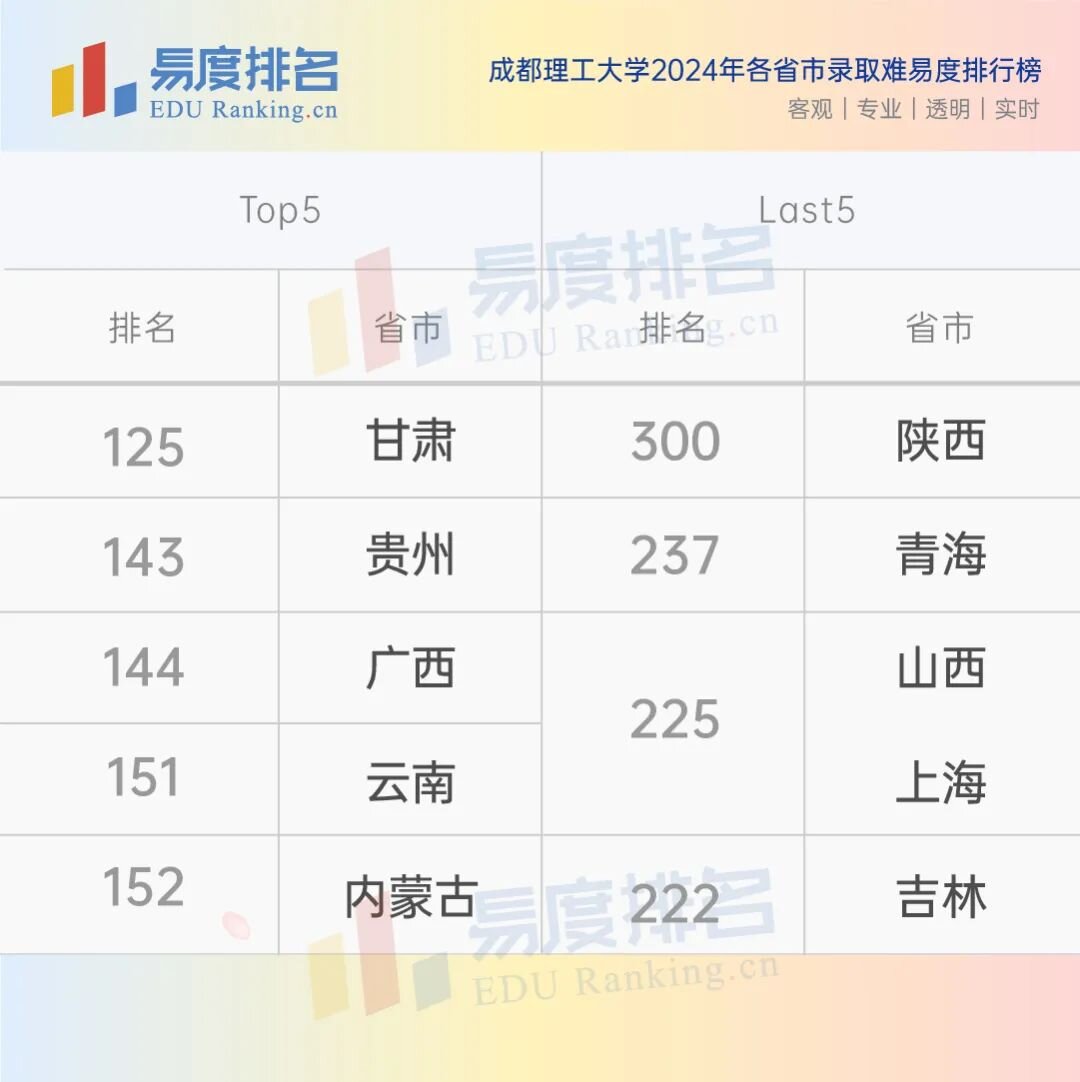 对比各省在成都理工大学的排名情况,位列前五的甘肃、贵州和云南都属于西部地区,且位于四川省周边,这些地区的教育资源相较四川的确逊色不少,报考难度较大也属于正常情况。学校在四川省的理科和文科方向的录取难易度依次为206名和217名,在所有省市中属于中等偏下的难度。