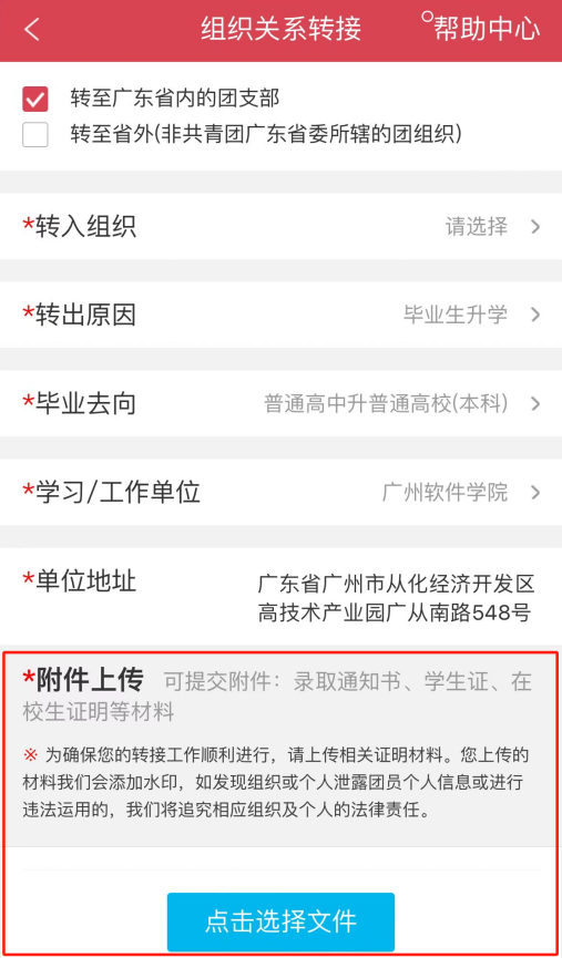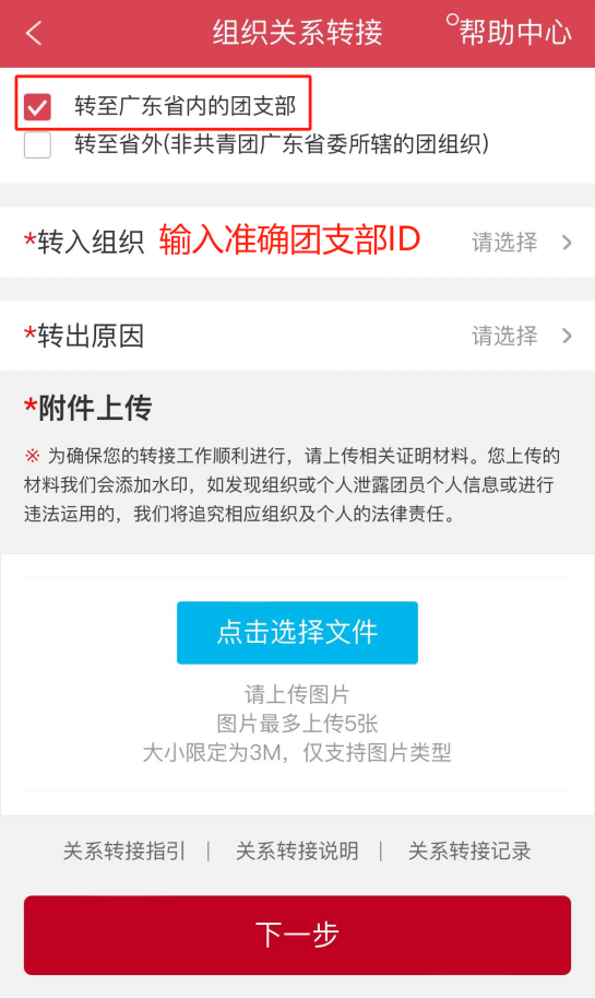 04选择“转至广东省内团支部”,并输入准确的团支部ID。