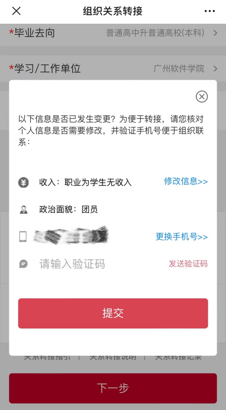 09点击下一步后,需要验证手机号,以便于组织联系,点击发送验证码并正确填入即可。若有信息更改,可点击“修改信息”或“更换手机号”进行修改。