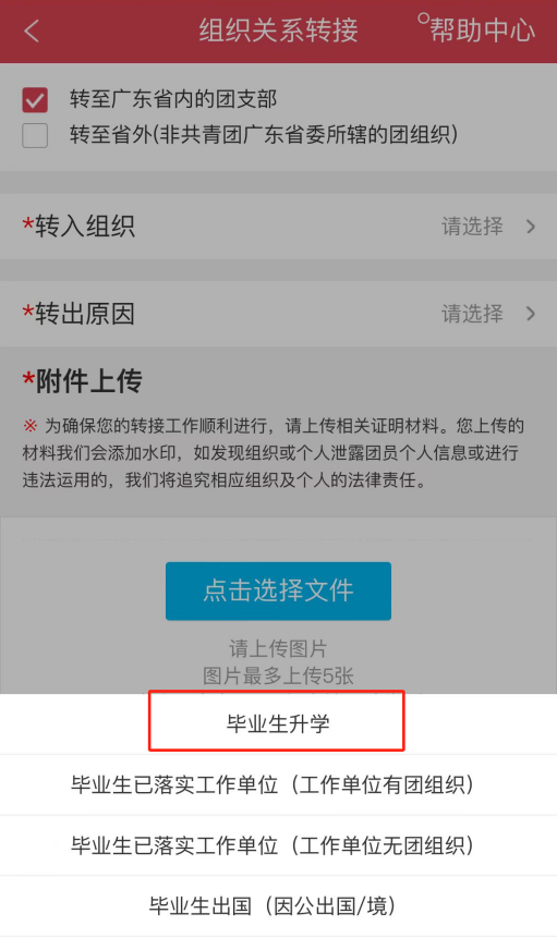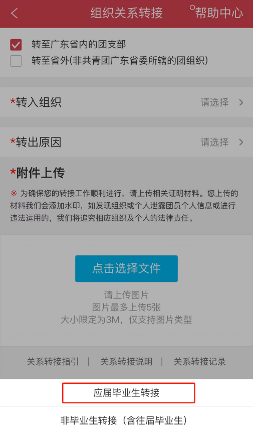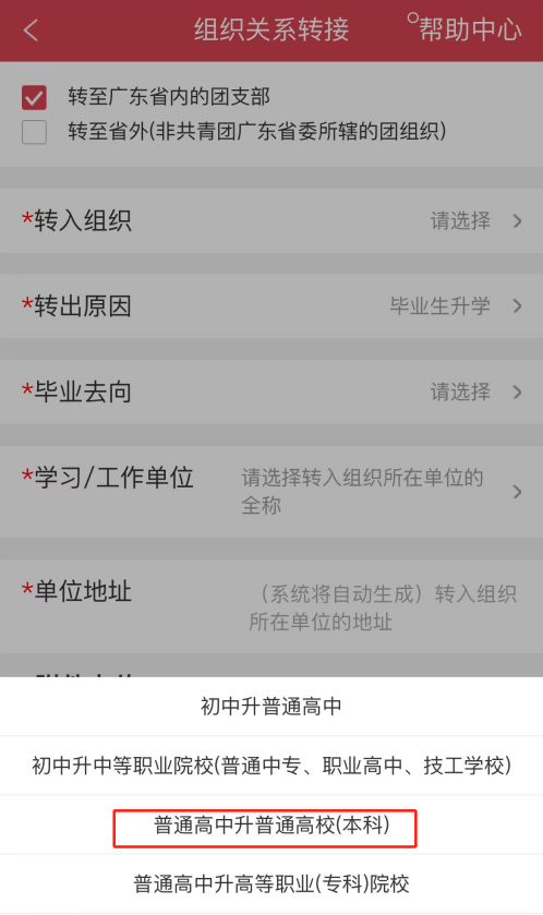 转入组织搜索:中国共产主义青年团转出原因选择“应届毕业生转接”,再点击“毕业生升学”