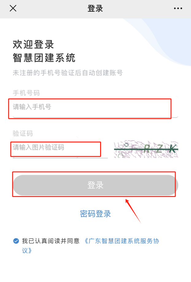 03进入登录页面,使用个人手机号进行登录,输入图片验证码,点击登录(未注册的手机号验证后将进入注册页面进行注册)