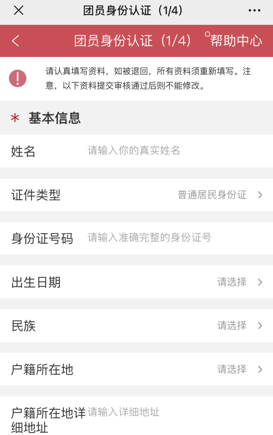 团员证首页基本信息要求全部填写(包括姓名、性别、民族、籍贯、出生年月、入团时间、入团地点、单位、团员证编号清晰正确并与团员档案相符),团员证上不得随意涂改和有任何画痕;