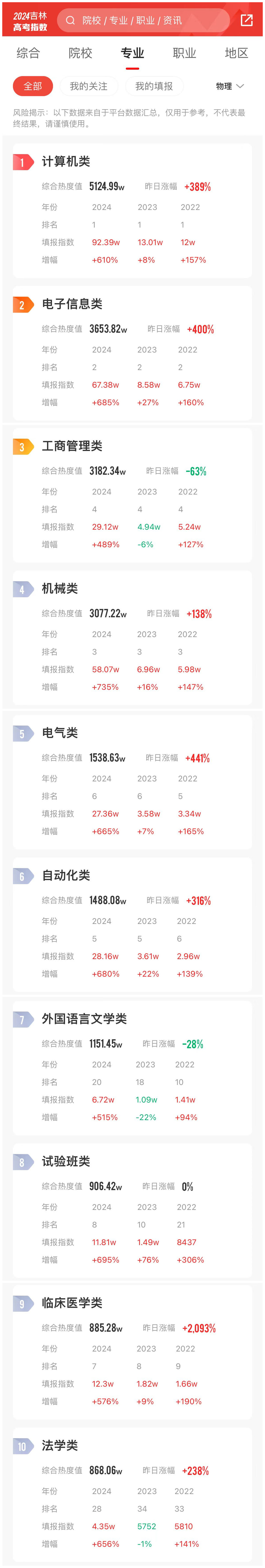 在今年吉林省高考生报考热度前十的专业中,计算机类专业位居第一,电子信息类、工商管理类专业紧随其后,占据前三位置。其余7个专业分别是机械类、电气类、自动化类、外国语言文学类、试验班类、临床医学类、法学类。