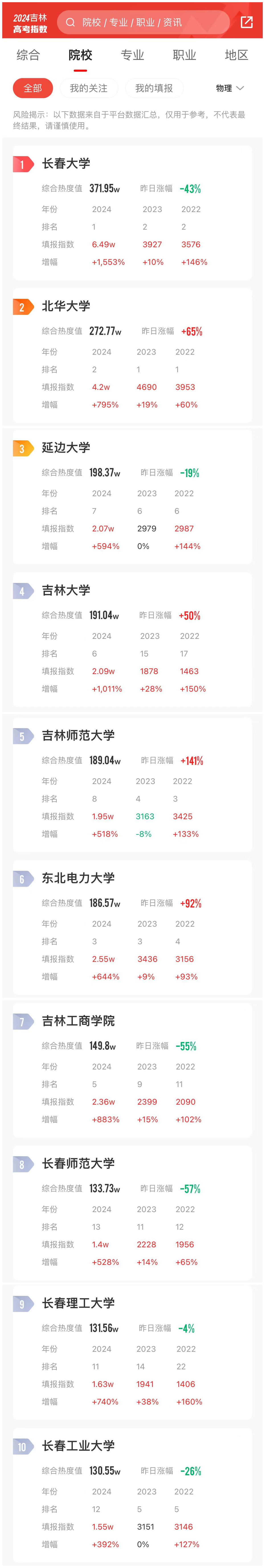 根据2024年吉林省院校报考热度榜显示,报考热度前十的院校中,除延边大学、吉林大学外,其他均为双非院校,其中身为985高校的吉林大学,仅排榜单第四。而计算机类专业以绝对优势登顶,力压计电子信息类与工商管理类专业;从考生偏好的职业榜来看,教师这一职业依然以其独特的魅力,稳稳地屹立于众多考生偏好的职业榜首之中……今年吉林省高考生报考情况如何?以下为《优志愿2024年高考指数排行榜》详情: