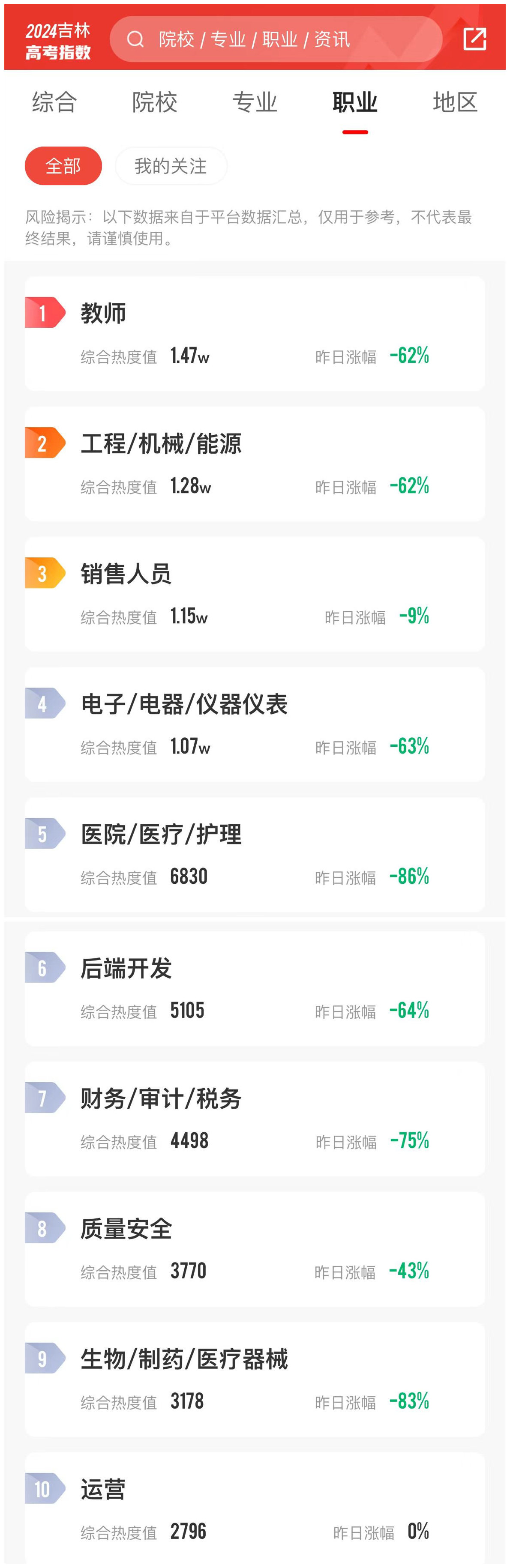 从职业热度榜综合审视,不难发现,考生及家长们在选择未来职业方向时,愈发倾向于那些具有稳固职业地位、不易被技术和市场轻易取代的岗位,如教师、医生和工程师等。然而,在对于没有严格专业限制的职业范畴内,销售岗位因其入行门槛低、工作时间自由且工资比较可观等特点,受到了不少考生和家长们的关注。此外,运营,作为产品、用户与市场之间不可或缺的桥梁,其独特的跨领域特性与高度灵活的岗位设计,在众多无需严格专业门槛的职业中脱颖而出,也成为了吉林考生及家长们热切关注的方向之一。