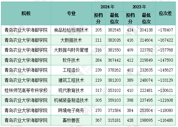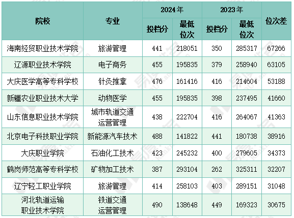 下表展示了2024年投档位次较上年投档位次下降较多的院校专业投档信息。河北物理类专科投档位次下降严重,投档位次下降TOP10的专业位次差均在11万位以上。位次下降较多的专业多来自