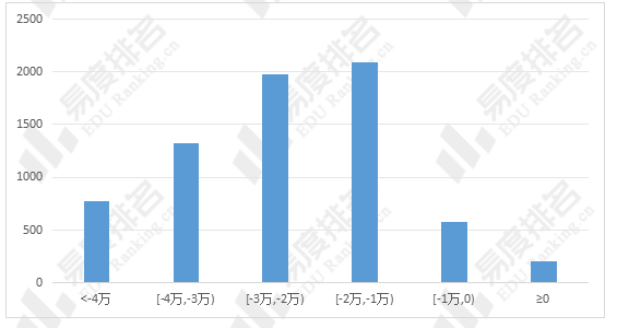 下图展示了河北2023年专业投档位次与2024年专业投档位次差的分布图,差值为负代表该专业2024年的投档位次有所下降,反之则代表该专业的投档位次有所上升。