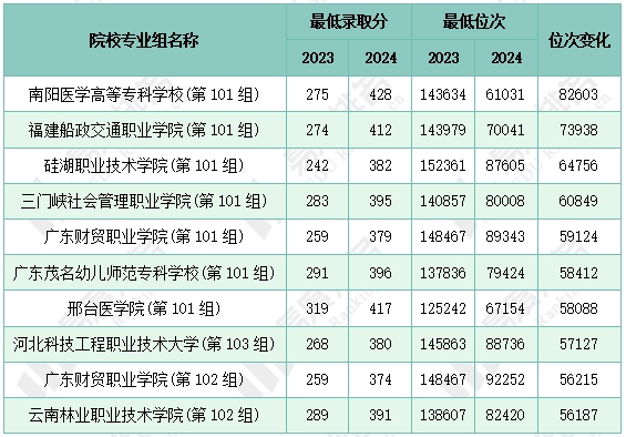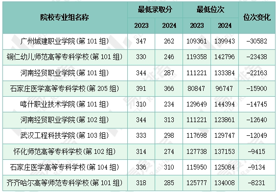 注:1.仅统计最近两年均招生的院校专业组;2.投档位次变化=专业组去年最低投档位次-专业组今年最低投档位次