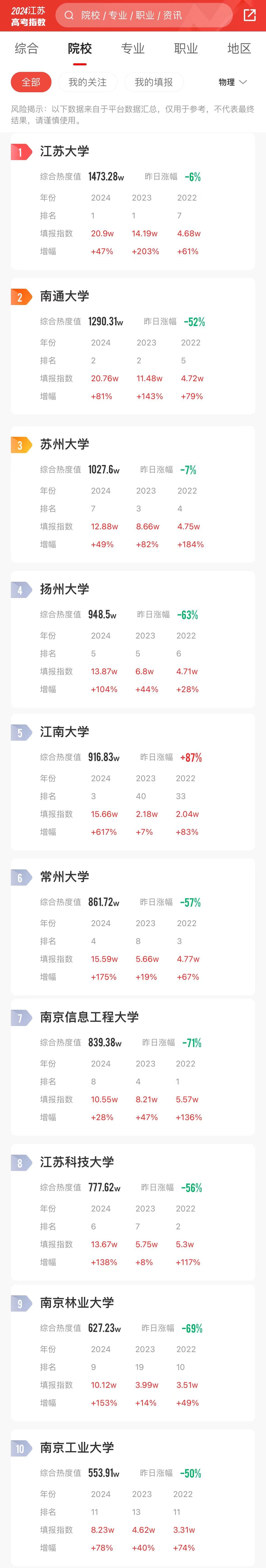 在每年的高考志愿填报阶段,各大院校的受欢迎程度以及各专业的热门指数等,始终是考生和家长们热议的焦点。那么今年江苏省高考生报考情况如何?以下为《优志愿2024年高考指数排行榜》详情: