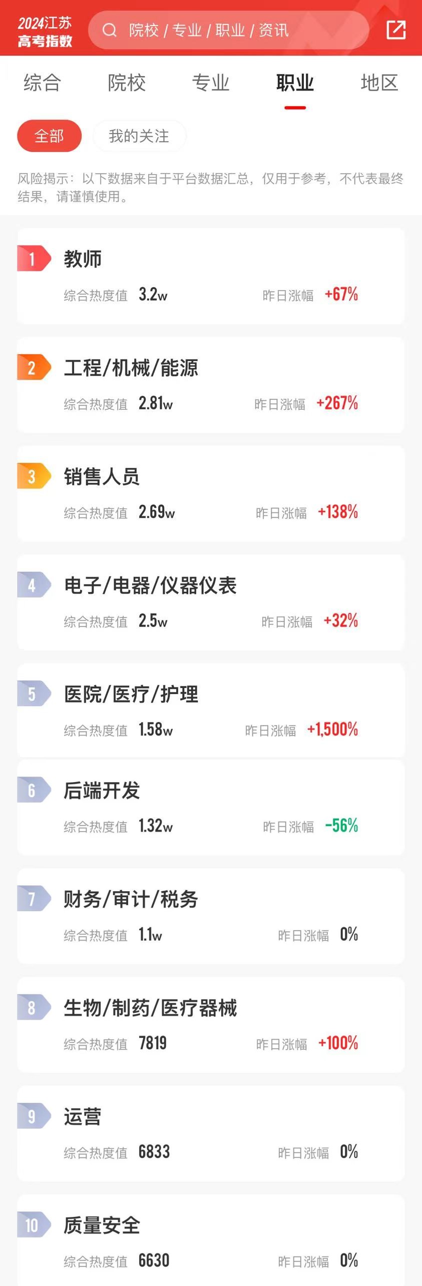 从职业热度榜整体情况来看,江苏考生在选择未来职业时展现多元化的倾向,一方面,考生想进入体制内,如教师、医生等职业;另一方面,考生们也对市场需求量大、工作上手较快的职业表现出浓厚的兴趣,如销售、运营等。