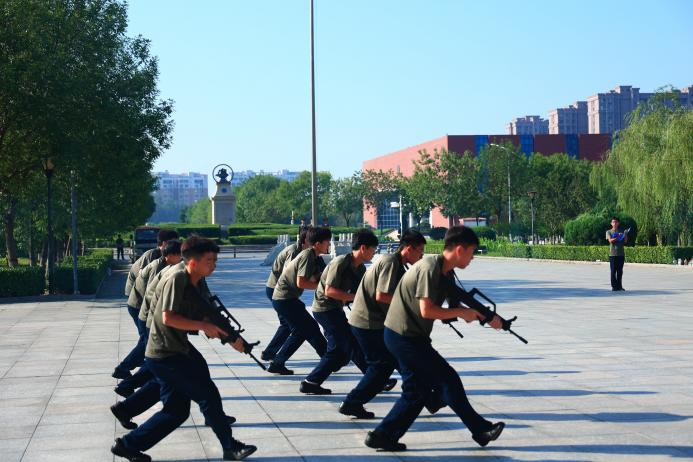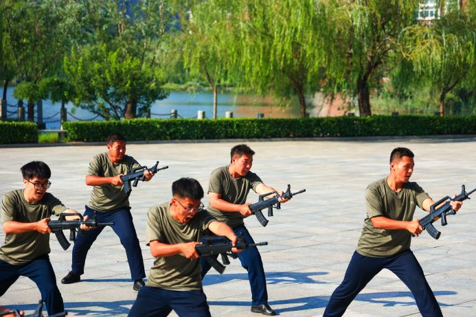 军训教官团汇报表演战术演练,他们时而匍匐前行,尽显英勇无畏;时而快速跃进,灵活躲避“敌人”攻击。他们雄姿英发,豪情满怀。骄阳似火,锻造钢铁之躯。炎炎夏日,铸就坚强之魂。