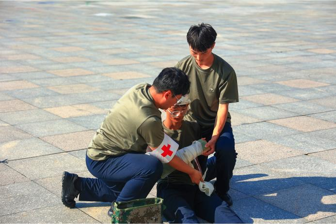 防化救援,体验核生化防护,学习战场救护。军训场上展英姿,救护防毒强技能。