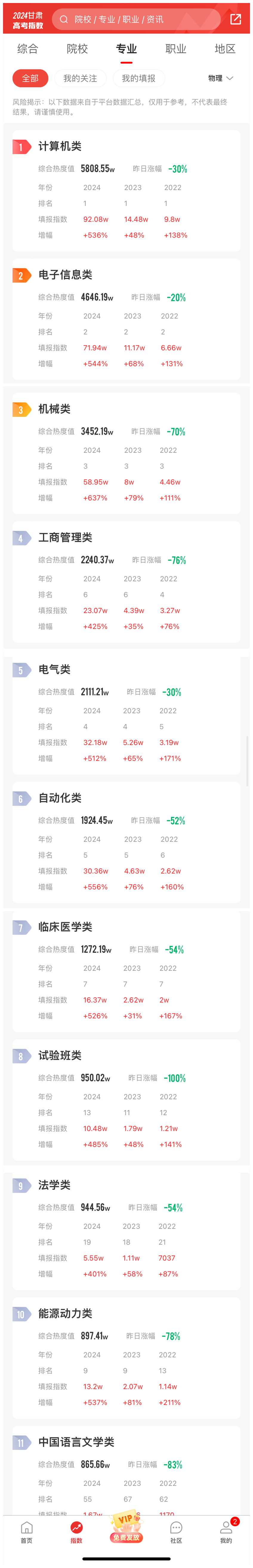 在今年甘肃省高考生报考热度前十的专业中,计算机类专业位居第一,电子信息类专业、机械类紧随其后,占据前三位置。其余7个专业分别是工商管理类、电气类、自动化类、临床医学类、试验班类、法学类、能源动力类。