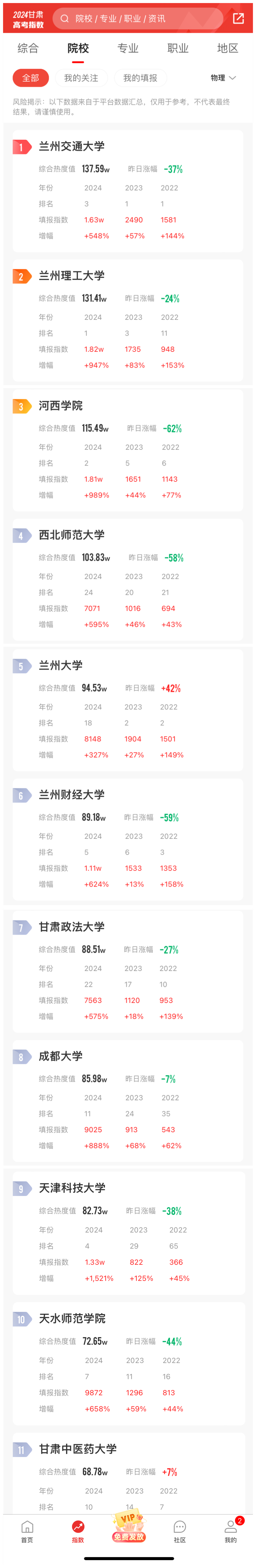 报考热度前十的学校中仅有1所985/211大学;而属于国家“985工程”的兰州大学被兰州交通大学超过。计算机类专业热度一直居高不下,力压电子信息类与机械类,荣登专业报考指数榜榜首;从考生偏好的职业榜来看,教师依旧是众多考生心目中的最憧憬的职业之一……今年甘肃省高考生报考情况如何?以下为《优志愿2024年高考指数排行榜》详情: